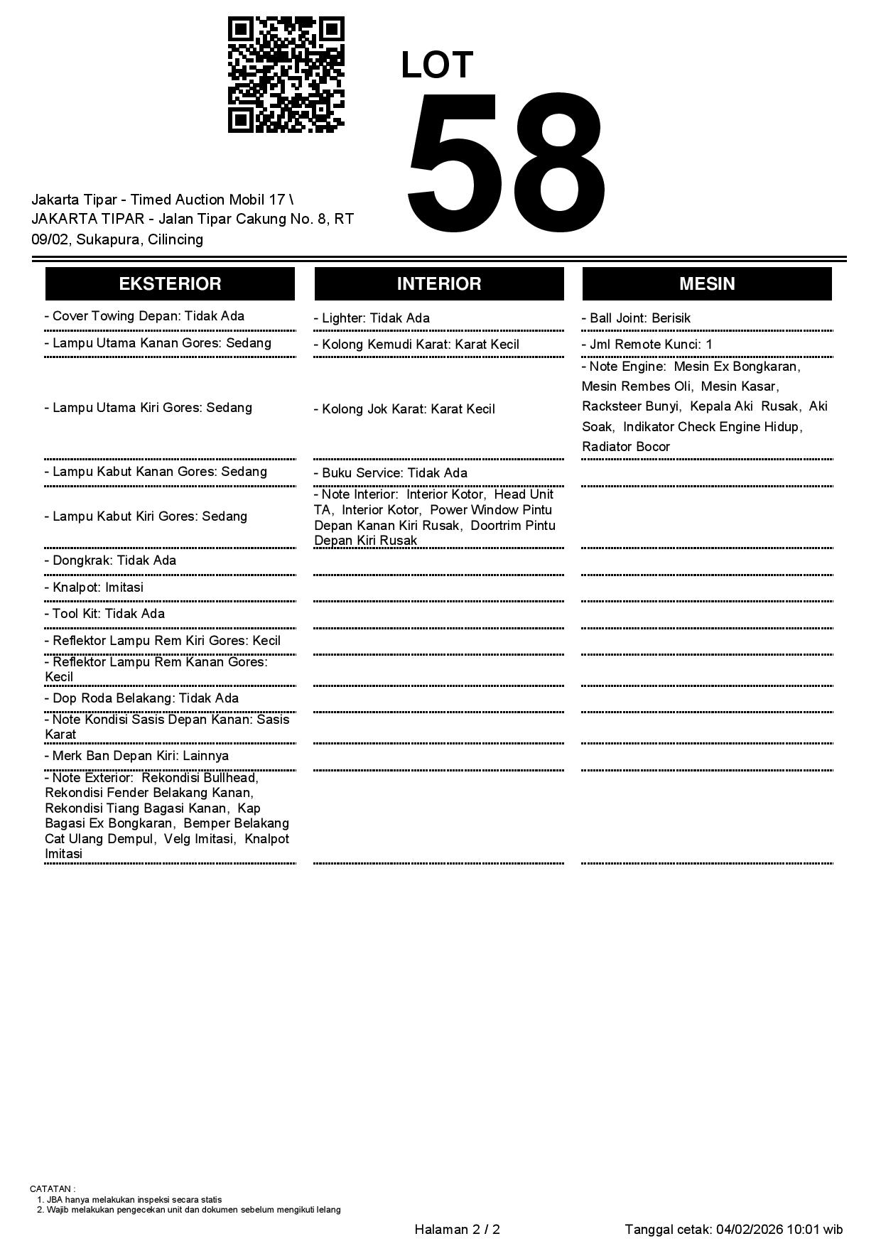 - Kondisi objek lelang dilelang apa adanya, baik kondisi fisik, mesin maupun legalitas kendaraan. Jika terdapat kekurangan/cacat baik yang terlihat maupun yang tidak terlihat, maka semua akan menjadi tanggung jawab/risiko Pemenang Lelang. Oleh karena itu, Pemenang Lelang melepaskan segala hak untuk menuntut dan/atau meminta ganti rugi atas hal tersebut kepada JBA.