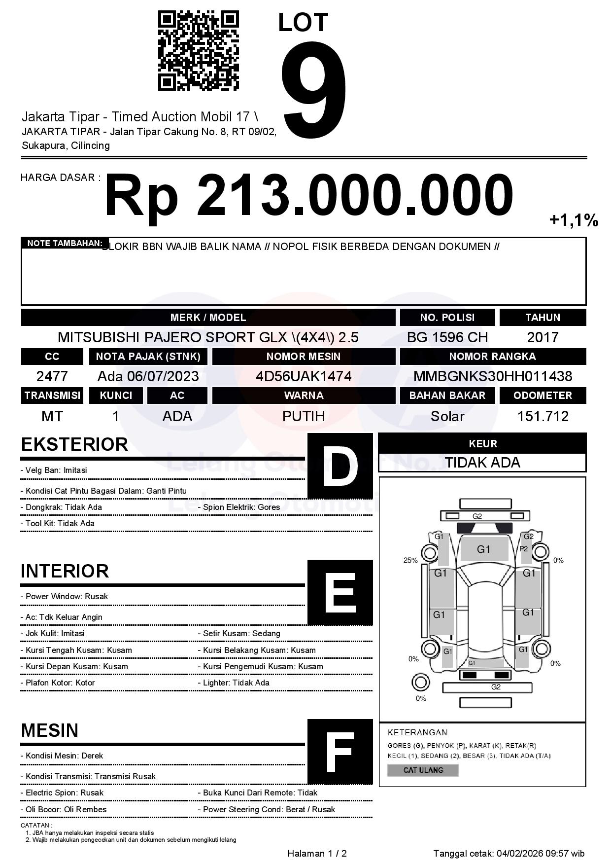 - Kondisi objek lelang dilelang apa adanya, baik kondisi fisik, mesin maupun legalitas kendaraan. Jika terdapat kekurangan/cacat baik yang terlihat maupun yang tidak terlihat, maka semua akan menjadi tanggung jawab/risiko Pemenang Lelang. Oleh karena itu, Pemenang Lelang melepaskan segala hak untuk menuntut dan/atau meminta ganti rugi atas hal tersebut kepada JBA.
