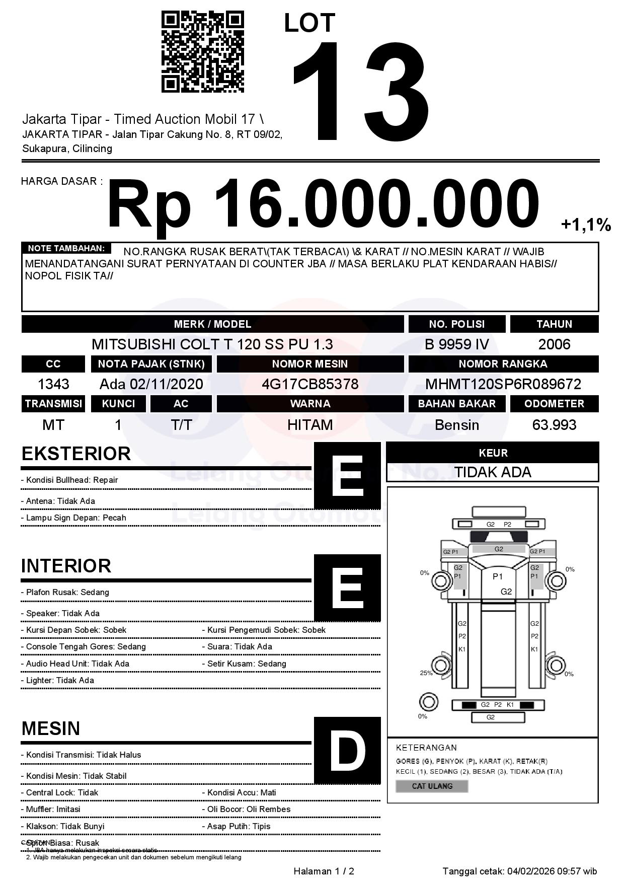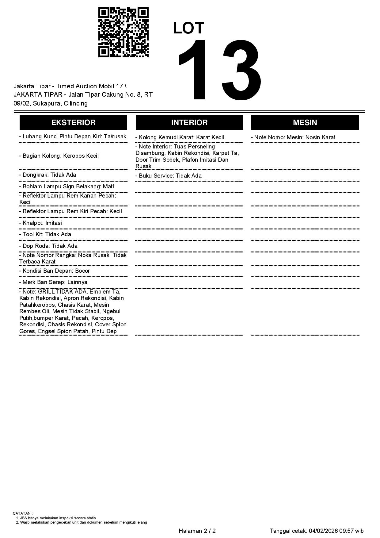 - Kondisi objek lelang dilelang apa adanya, baik kondisi fisik, mesin maupun legalitas kendaraan. Jika terdapat kekurangan/cacat baik yang terlihat maupun yang tidak terlihat, maka semua akan menjadi tanggung jawab/risiko Pemenang Lelang. Oleh karena itu, Pemenang Lelang melepaskan segala hak untuk menuntut dan/atau meminta ganti rugi atas hal tersebut kepada JBA.