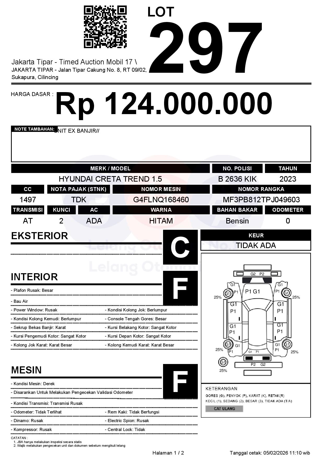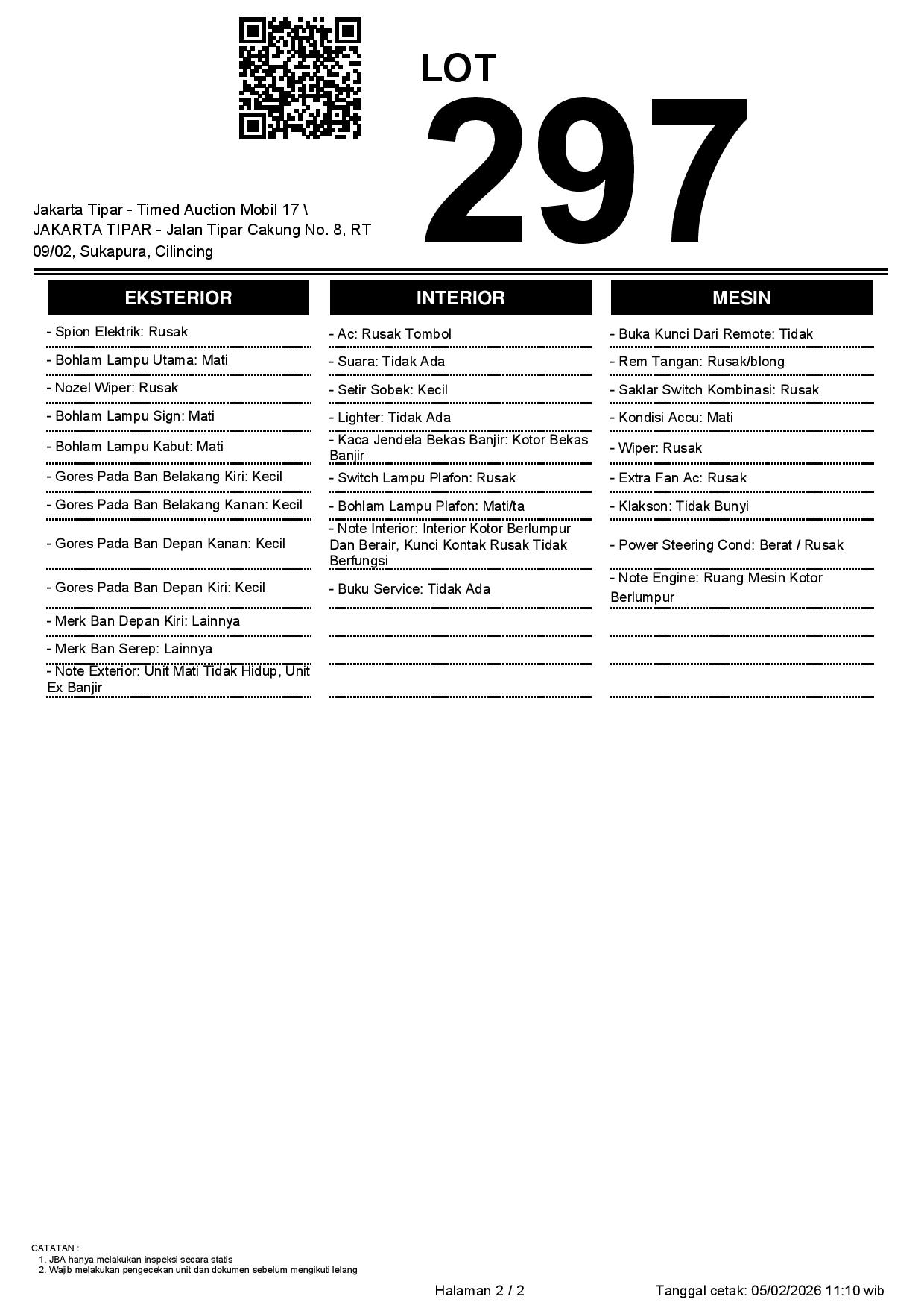 - Kondisi objek lelang dilelang apa adanya, baik kondisi fisik, mesin maupun legalitas kendaraan. Jika terdapat kekurangan/cacat baik yang terlihat maupun yang tidak terlihat, maka semua akan menjadi tanggung jawab/risiko Pemenang Lelang. Oleh karena itu, Pemenang Lelang melepaskan segala hak untuk menuntut dan/atau meminta ganti rugi atas hal tersebut kepada JBA.