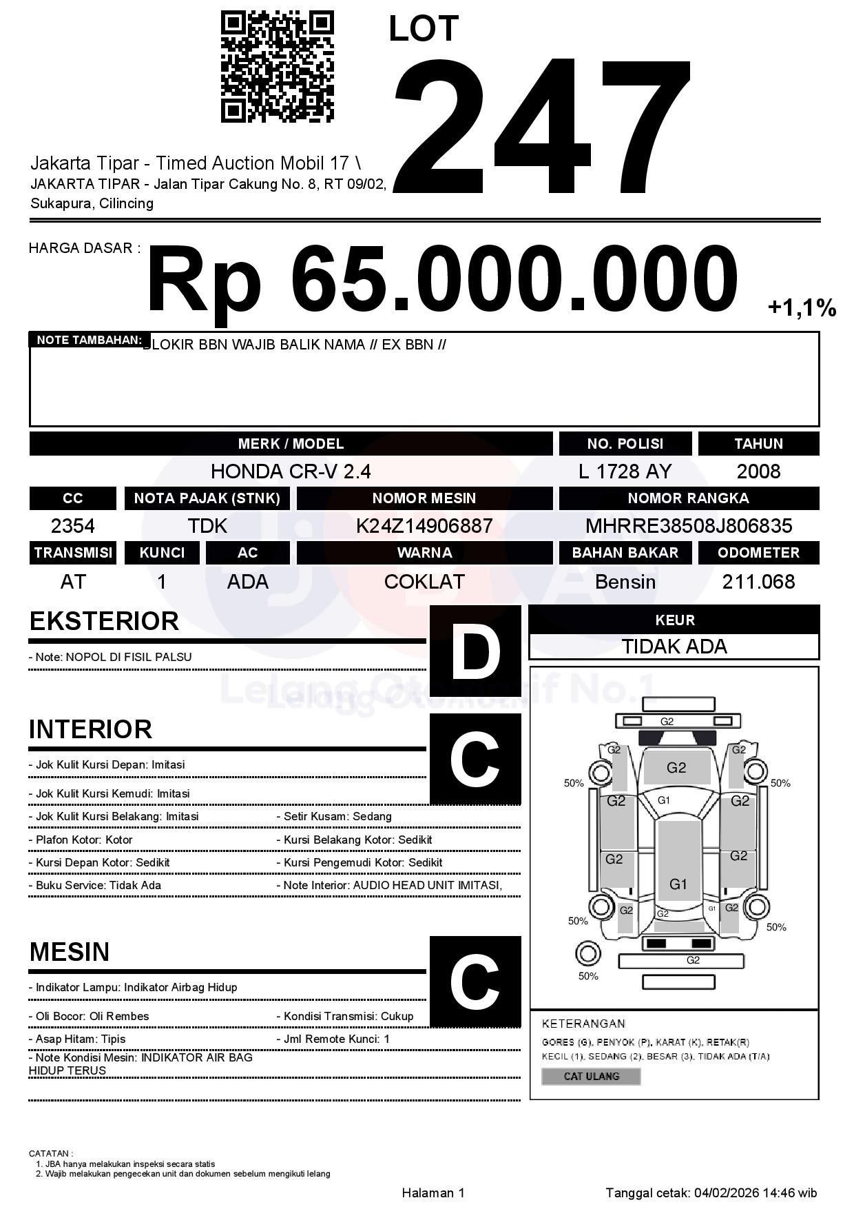 - Kondisi objek lelang dilelang apa adanya, baik kondisi fisik, mesin maupun legalitas kendaraan. Jika terdapat kekurangan/cacat baik yang terlihat maupun yang tidak terlihat, maka semua akan menjadi tanggung jawab/risiko Pemenang Lelang. Oleh karena itu, Pemenang Lelang melepaskan segala hak untuk menuntut dan/atau meminta ganti rugi atas hal tersebut kepada JBA.