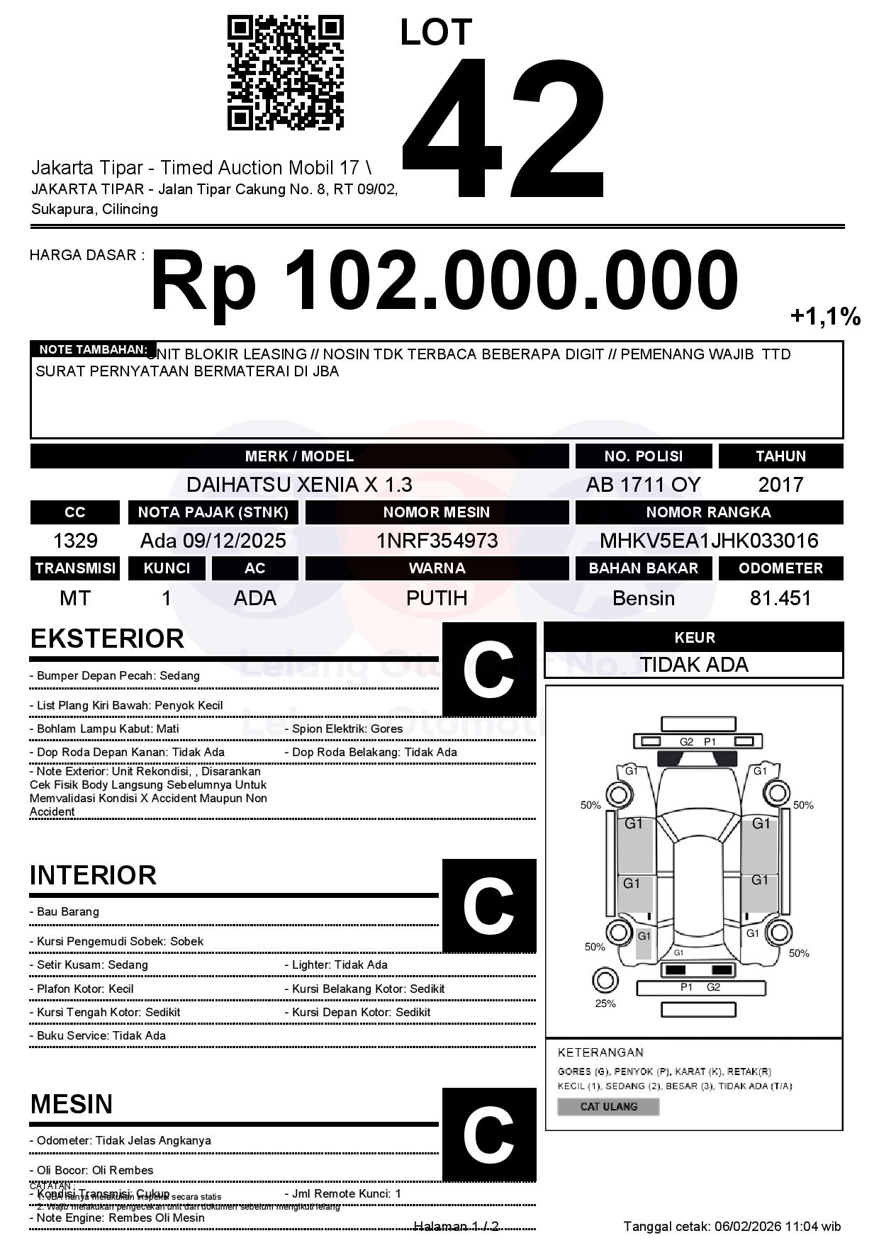 - Kondisi objek lelang dilelang apa adanya, baik kondisi fisik, mesin maupun legalitas kendaraan. Jika terdapat kekurangan/cacat baik yang terlihat maupun yang tidak terlihat, maka semua akan menjadi tanggung jawab/risiko Pemenang Lelang. Oleh karena itu, Pemenang Lelang melepaskan segala hak untuk menuntut dan/atau meminta ganti rugi atas hal tersebut kepada JBA.