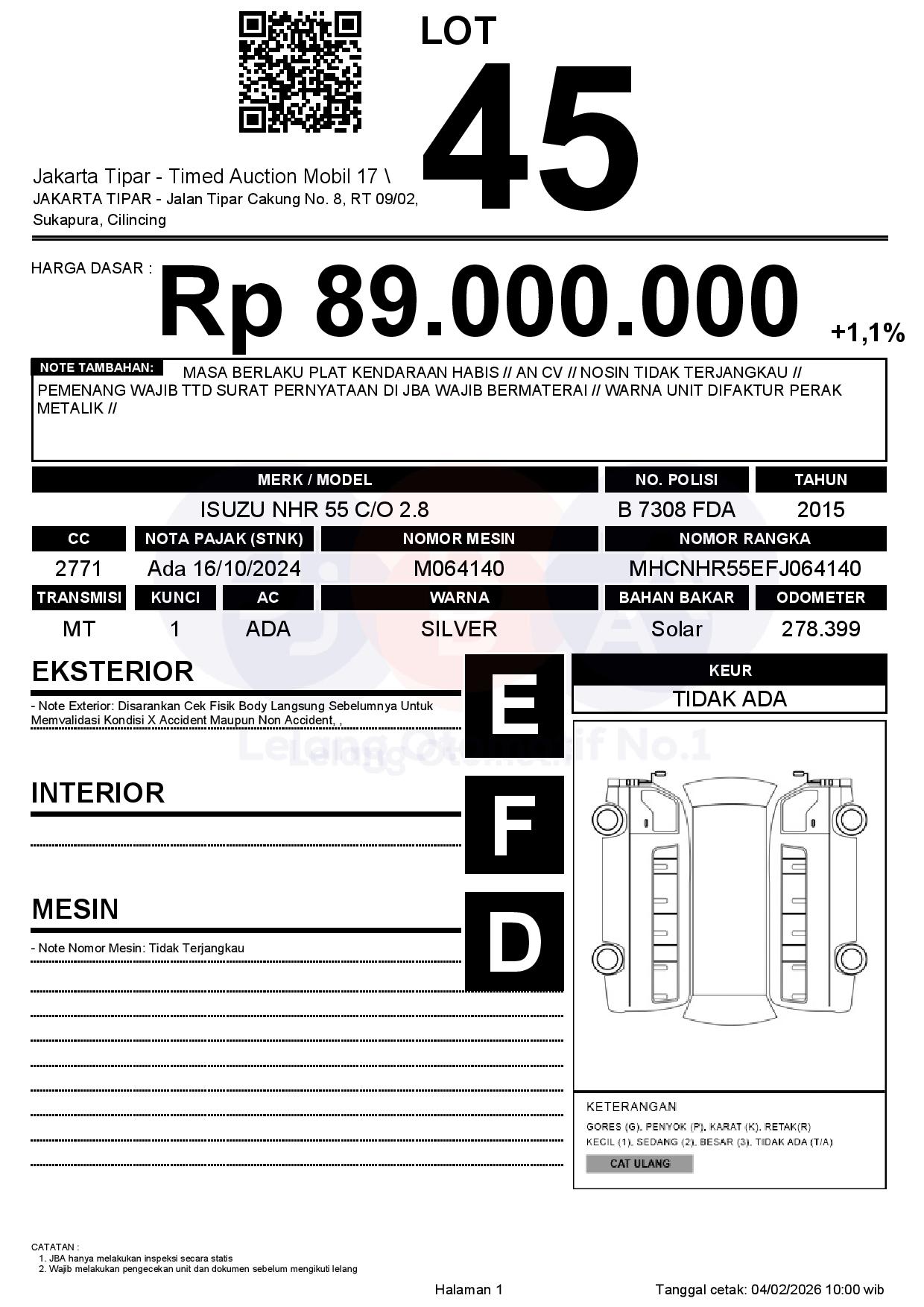 - Kondisi objek lelang dilelang apa adanya, baik kondisi fisik, mesin maupun legalitas kendaraan. Jika terdapat kekurangan/cacat baik yang terlihat maupun yang tidak terlihat, maka semua akan menjadi tanggung jawab/risiko Pemenang Lelang. Oleh karena itu, Pemenang Lelang melepaskan segala hak untuk menuntut dan/atau meminta ganti rugi atas hal tersebut kepada JBA.