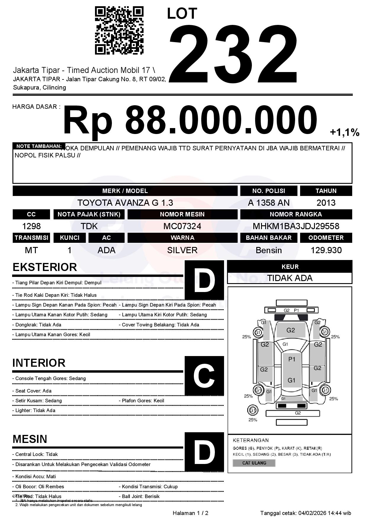 - Kondisi objek lelang dilelang apa adanya, baik kondisi fisik, mesin maupun legalitas kendaraan. Jika terdapat kekurangan/cacat baik yang terlihat maupun yang tidak terlihat, maka semua akan menjadi tanggung jawab/risiko Pemenang Lelang. Oleh karena itu, Pemenang Lelang melepaskan segala hak untuk menuntut dan/atau meminta ganti rugi atas hal tersebut kepada JBA.