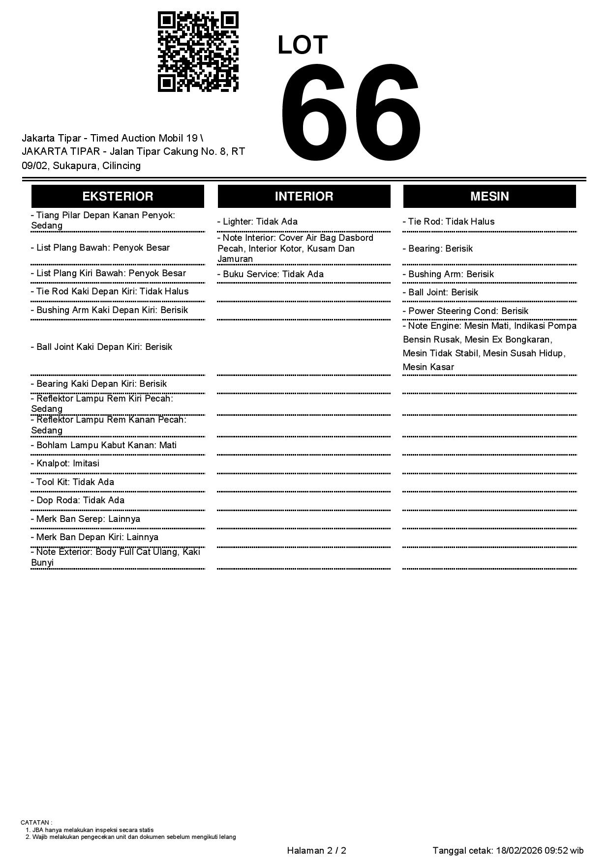 - Kondisi objek lelang dilelang apa adanya, baik kondisi fisik, mesin maupun legalitas kendaraan. Jika terdapat kekurangan/cacat baik yang terlihat maupun yang tidak terlihat, maka semua akan menjadi tanggung jawab/risiko Pemenang Lelang. Oleh karena itu, Pemenang Lelang melepaskan segala hak untuk menuntut dan/atau meminta ganti rugi atas hal tersebut kepada JBA.