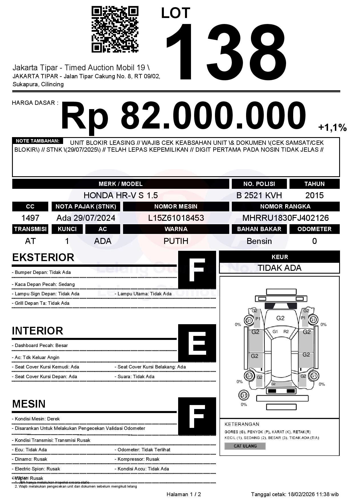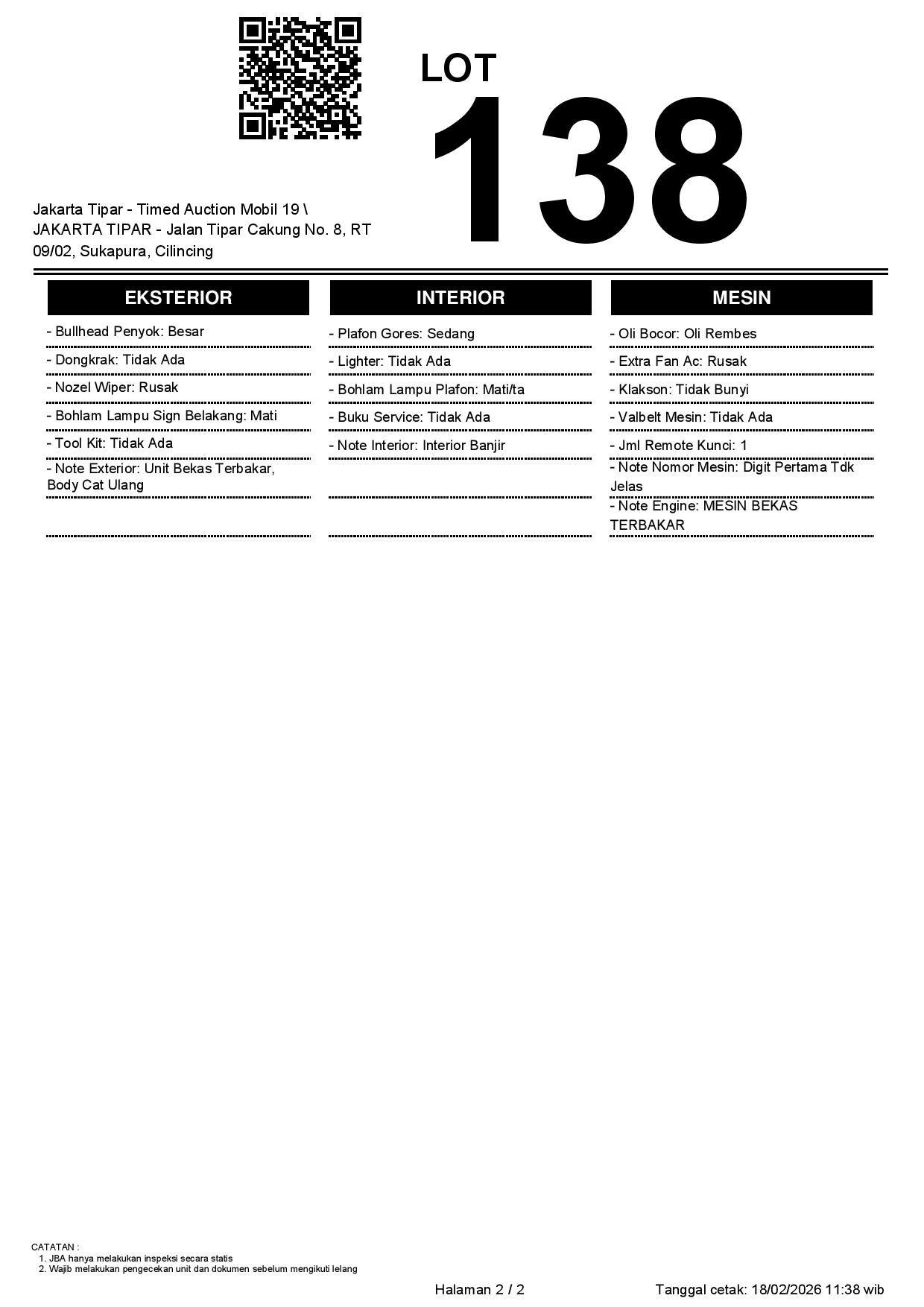 - Kondisi objek lelang dilelang apa adanya, baik kondisi fisik, mesin maupun legalitas kendaraan. Jika terdapat kekurangan/cacat baik yang terlihat maupun yang tidak terlihat, maka semua akan menjadi tanggung jawab/risiko Pemenang Lelang. Oleh karena itu, Pemenang Lelang melepaskan segala hak untuk menuntut dan/atau meminta ganti rugi atas hal tersebut kepada JBA.