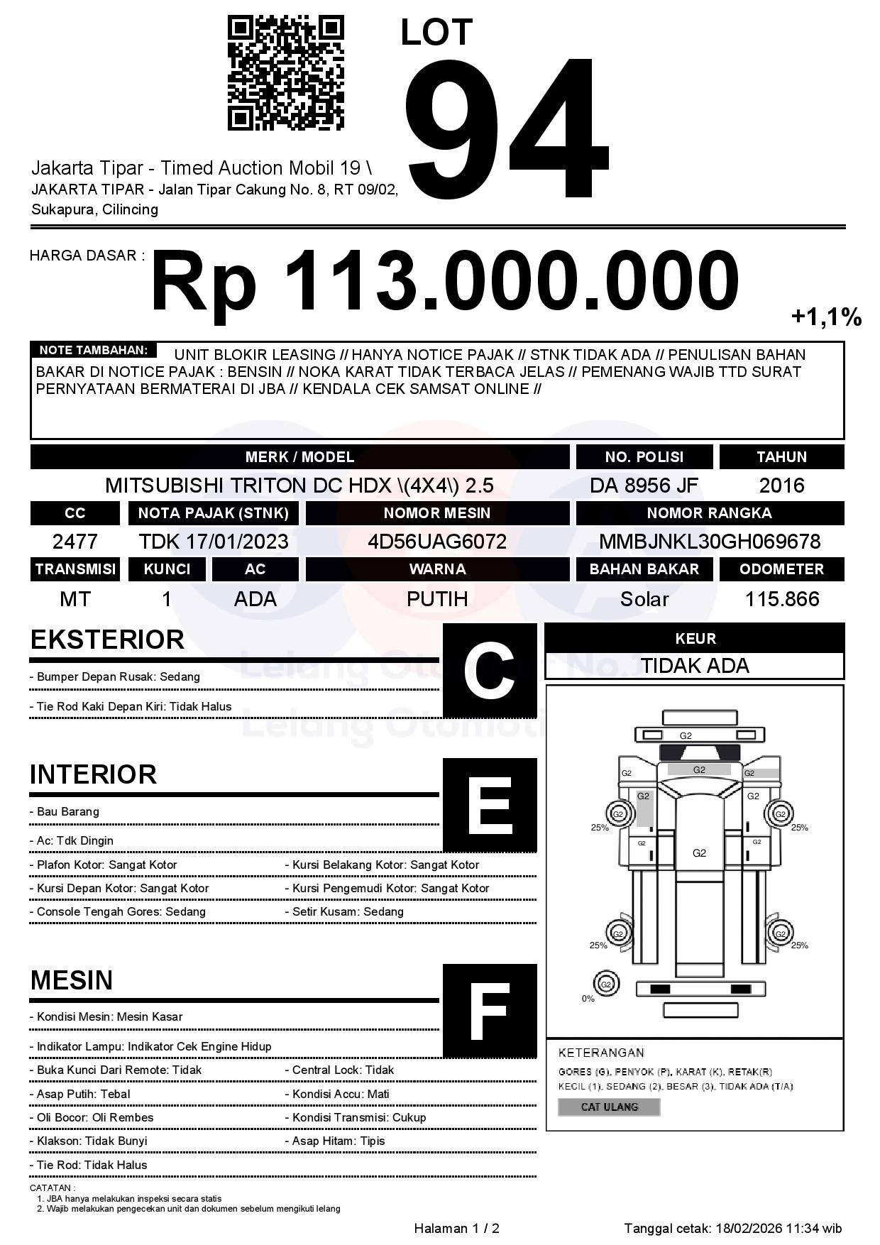 - Kondisi objek lelang dilelang apa adanya, baik kondisi fisik, mesin maupun legalitas kendaraan. Jika terdapat kekurangan/cacat baik yang terlihat maupun yang tidak terlihat, maka semua akan menjadi tanggung jawab/risiko Pemenang Lelang. Oleh karena itu, Pemenang Lelang melepaskan segala hak untuk menuntut dan/atau meminta ganti rugi atas hal tersebut kepada JBA.