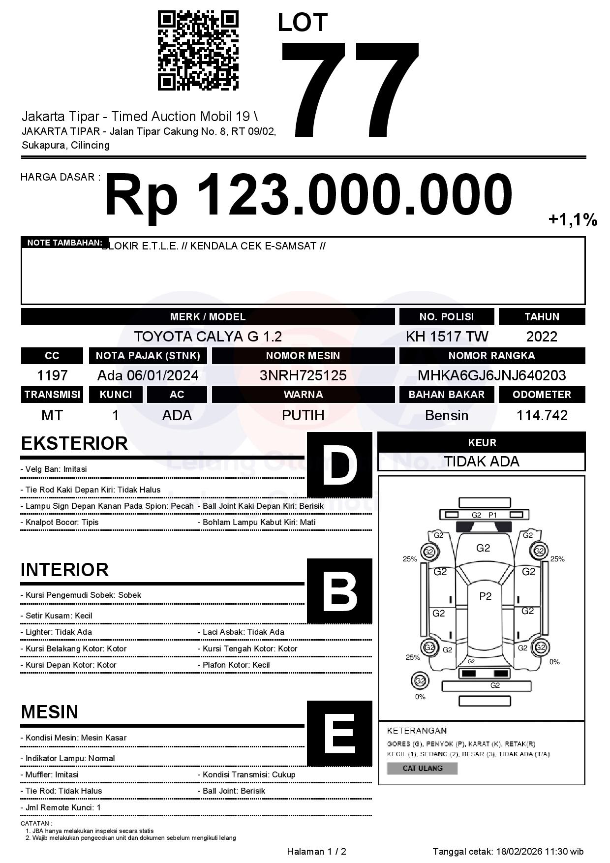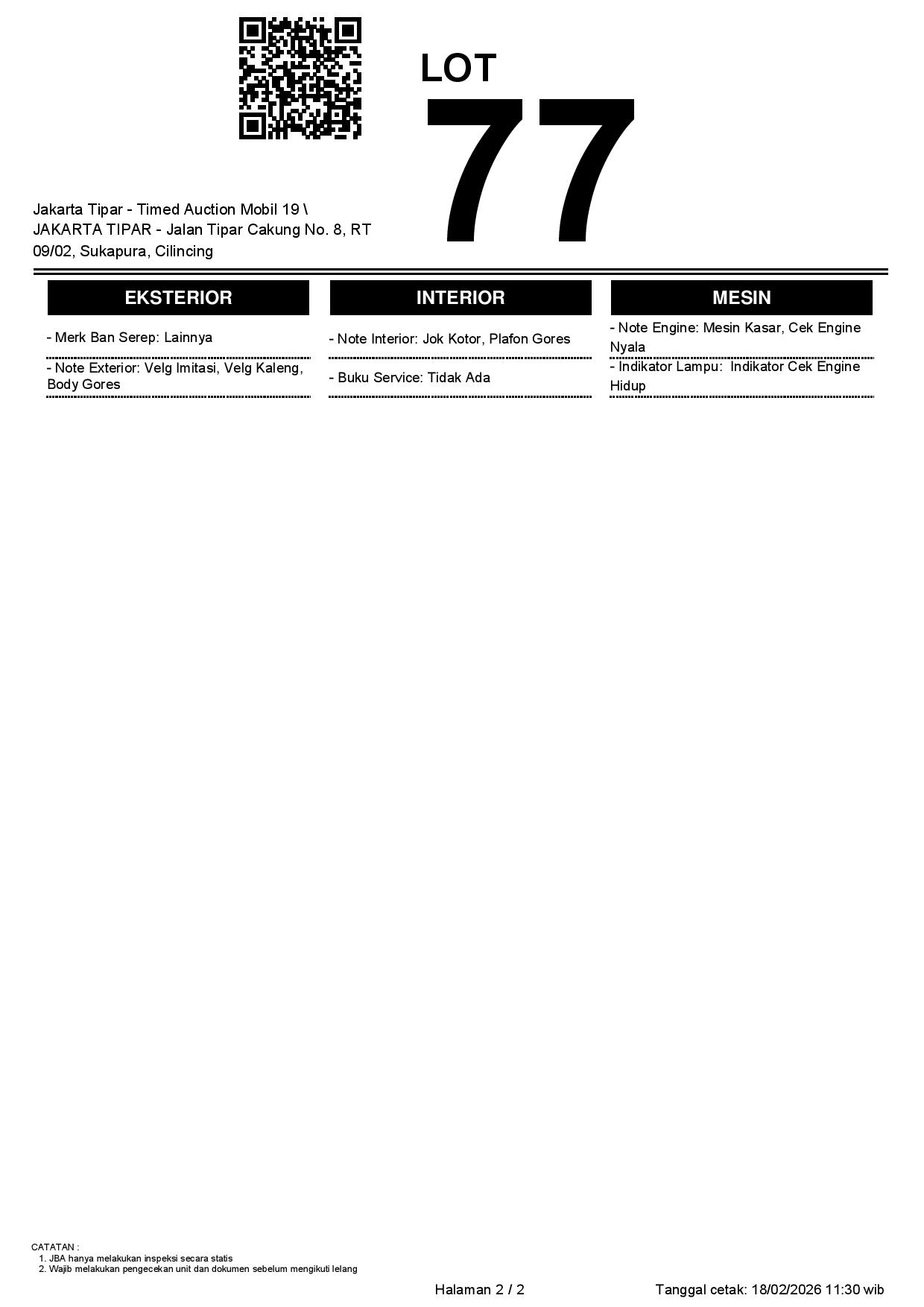 - Kondisi objek lelang dilelang apa adanya, baik kondisi fisik, mesin maupun legalitas kendaraan. Jika terdapat kekurangan/cacat baik yang terlihat maupun yang tidak terlihat, maka semua akan menjadi tanggung jawab/risiko Pemenang Lelang. Oleh karena itu, Pemenang Lelang melepaskan segala hak untuk menuntut dan/atau meminta ganti rugi atas hal tersebut kepada JBA.