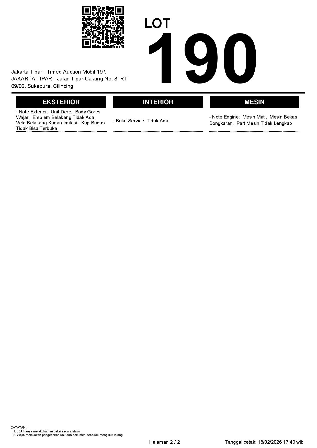 - Kondisi objek lelang dilelang apa adanya, baik kondisi fisik, mesin maupun legalitas kendaraan. Jika terdapat kekurangan/cacat baik yang terlihat maupun yang tidak terlihat, maka semua akan menjadi tanggung jawab/risiko Pemenang Lelang. Oleh karena itu, Pemenang Lelang melepaskan segala hak untuk menuntut dan/atau meminta ganti rugi atas hal tersebut kepada JBA.