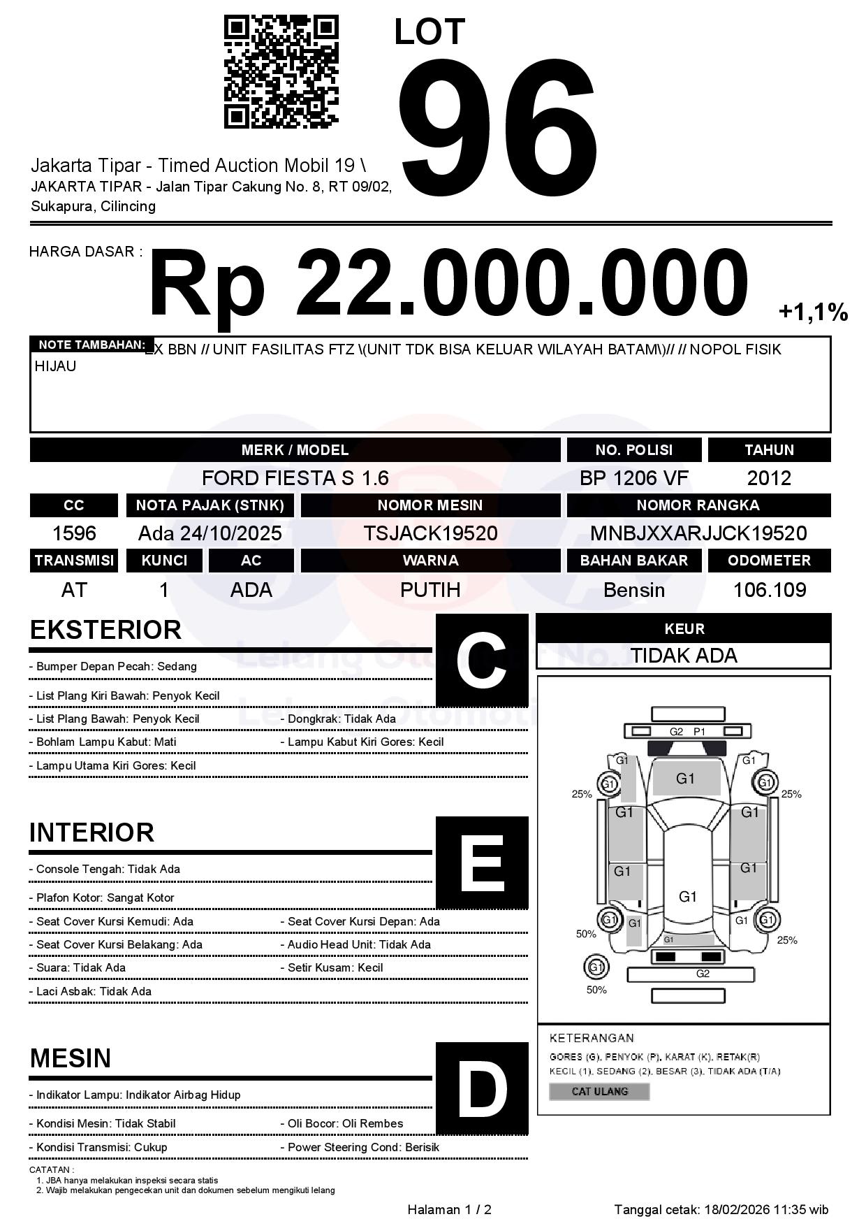 - Kondisi objek lelang dilelang apa adanya, baik kondisi fisik, mesin maupun legalitas kendaraan. Jika terdapat kekurangan/cacat baik yang terlihat maupun yang tidak terlihat, maka semua akan menjadi tanggung jawab/risiko Pemenang Lelang. Oleh karena itu, Pemenang Lelang melepaskan segala hak untuk menuntut dan/atau meminta ganti rugi atas hal tersebut kepada JBA.