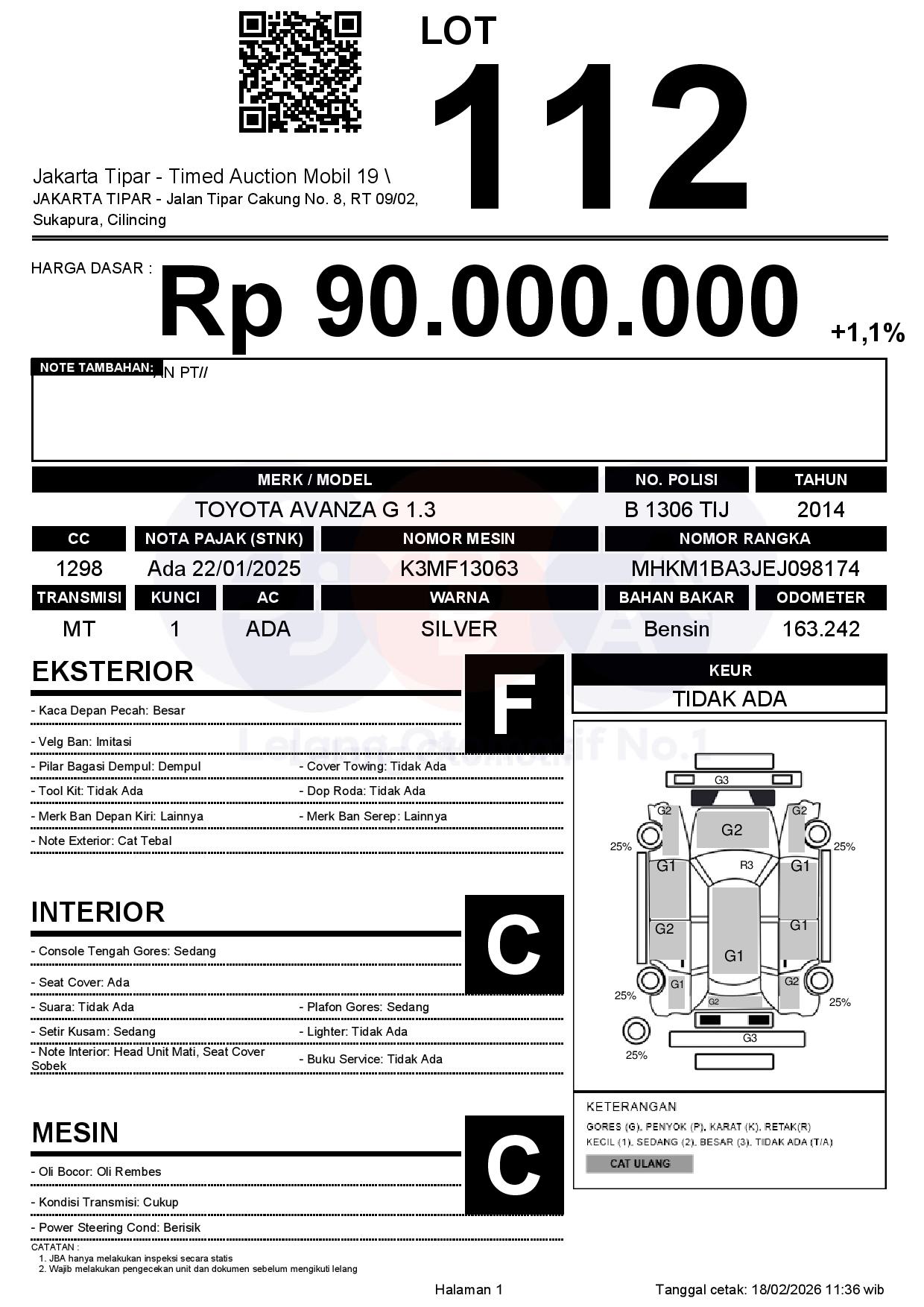 - Kondisi objek lelang dilelang apa adanya, baik kondisi fisik, mesin maupun legalitas kendaraan. Jika terdapat kekurangan/cacat baik yang terlihat maupun yang tidak terlihat, maka semua akan menjadi tanggung jawab/risiko Pemenang Lelang. Oleh karena itu, Pemenang Lelang melepaskan segala hak untuk menuntut dan/atau meminta ganti rugi atas hal tersebut kepada JBA.