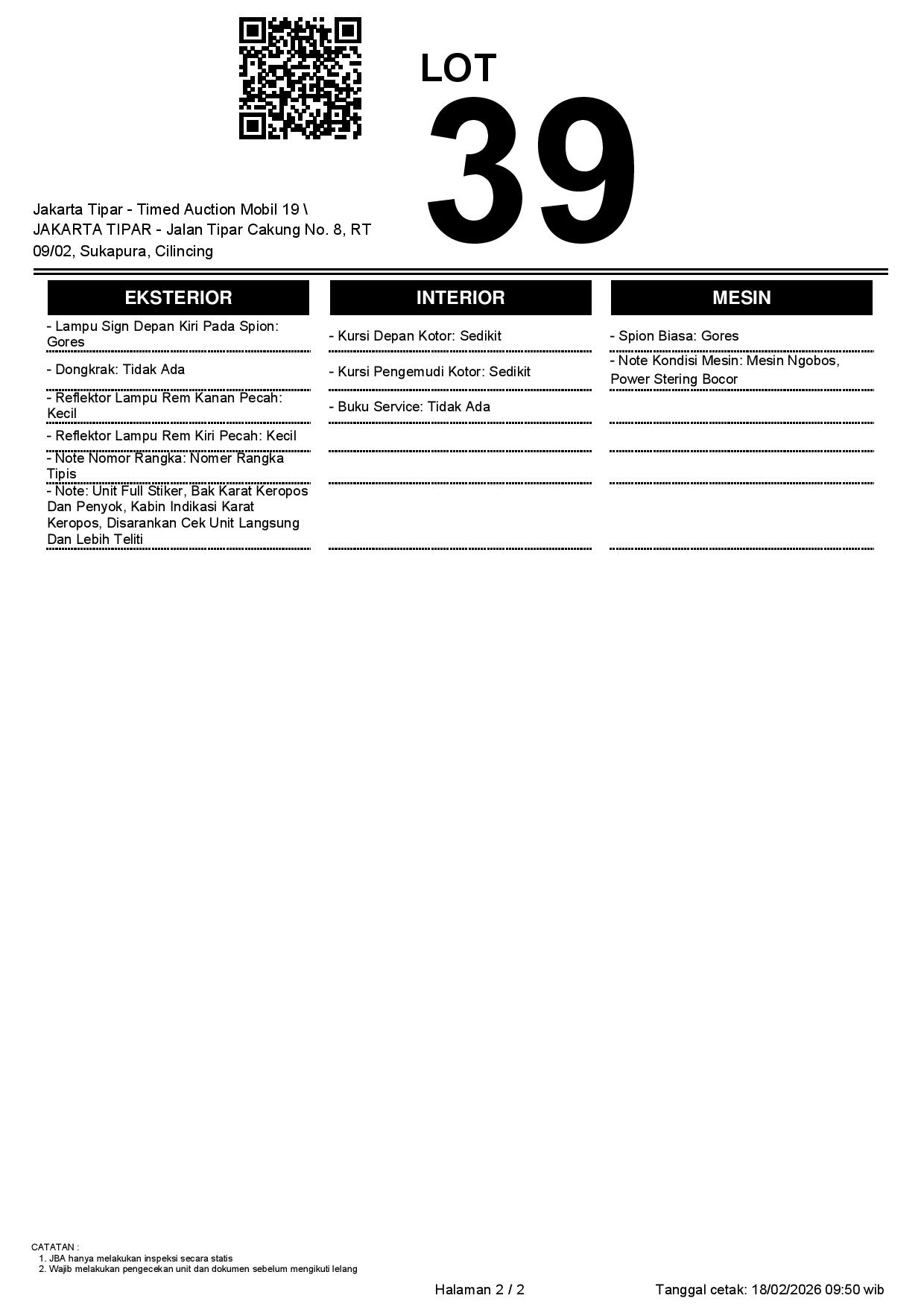 - Kondisi objek lelang dilelang apa adanya, baik kondisi fisik, mesin maupun legalitas kendaraan. Jika terdapat kekurangan/cacat baik yang terlihat maupun yang tidak terlihat, maka semua akan menjadi tanggung jawab/risiko Pemenang Lelang. Oleh karena itu, Pemenang Lelang melepaskan segala hak untuk menuntut dan/atau meminta ganti rugi atas hal tersebut kepada JBA.