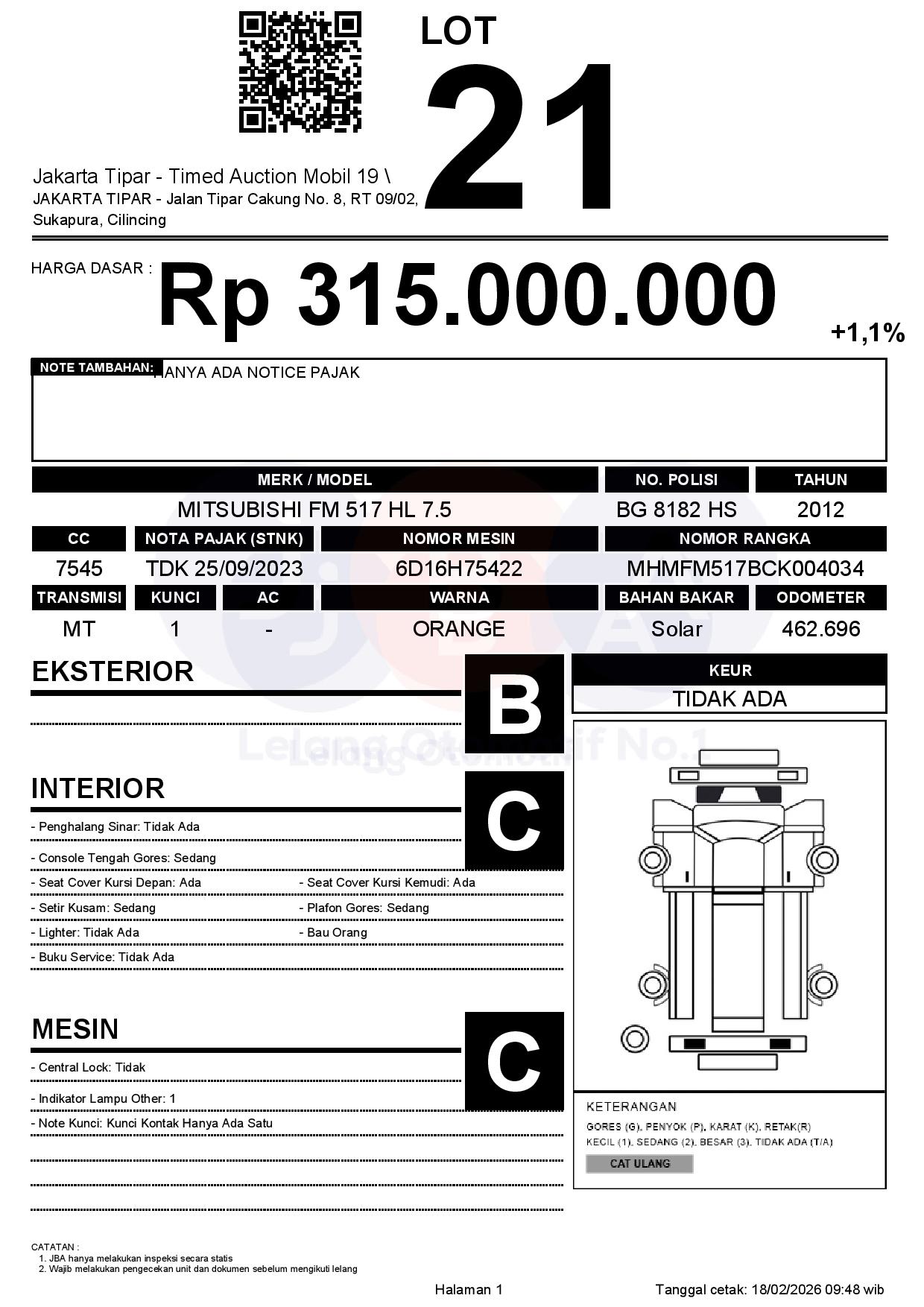 - Kondisi objek lelang dilelang apa adanya, baik kondisi fisik, mesin maupun legalitas kendaraan. Jika terdapat kekurangan/cacat baik yang terlihat maupun yang tidak terlihat, maka semua akan menjadi tanggung jawab/risiko Pemenang Lelang. Oleh karena itu, Pemenang Lelang melepaskan segala hak untuk menuntut dan/atau meminta ganti rugi atas hal tersebut kepada JBA.