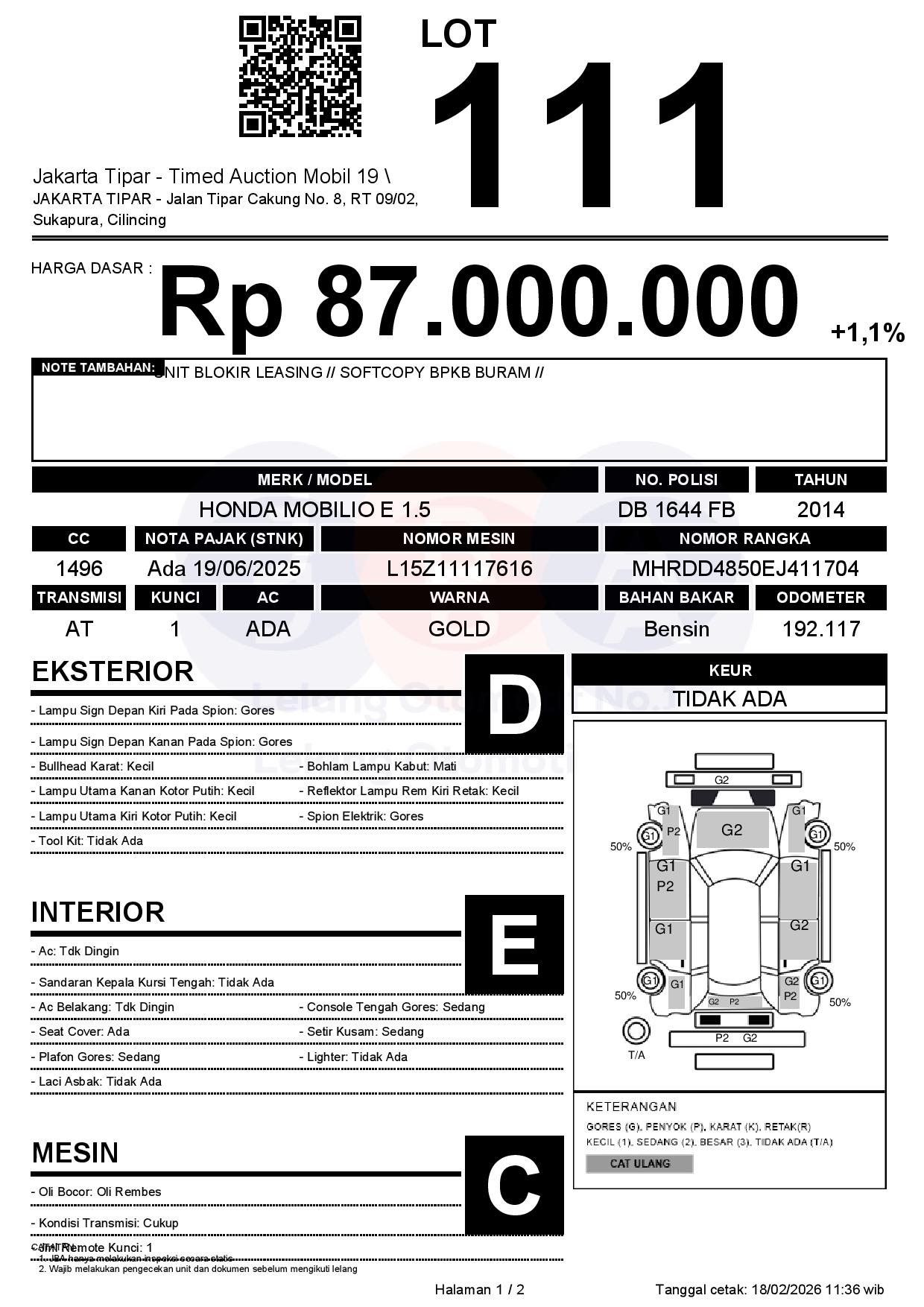 - Kondisi objek lelang dilelang apa adanya, baik kondisi fisik, mesin maupun legalitas kendaraan. Jika terdapat kekurangan/cacat baik yang terlihat maupun yang tidak terlihat, maka semua akan menjadi tanggung jawab/risiko Pemenang Lelang. Oleh karena itu, Pemenang Lelang melepaskan segala hak untuk menuntut dan/atau meminta ganti rugi atas hal tersebut kepada JBA.