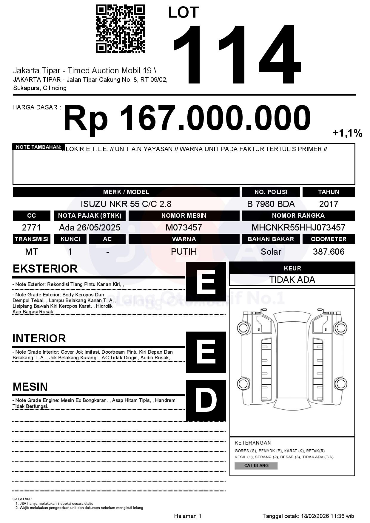 - Kondisi objek lelang dilelang apa adanya, baik kondisi fisik, mesin maupun legalitas kendaraan. Jika terdapat kekurangan/cacat baik yang terlihat maupun yang tidak terlihat, maka semua akan menjadi tanggung jawab/risiko Pemenang Lelang. Oleh karena itu, Pemenang Lelang melepaskan segala hak untuk menuntut dan/atau meminta ganti rugi atas hal tersebut kepada JBA.