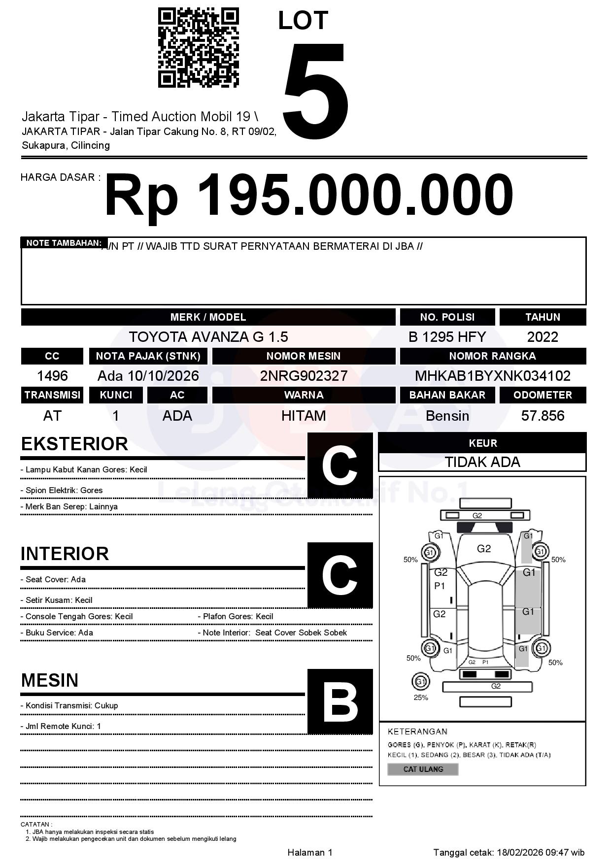 - Kondisi objek lelang dilelang apa adanya, baik kondisi fisik, mesin maupun legalitas kendaraan. Jika terdapat kekurangan/cacat baik yang terlihat maupun yang tidak terlihat, maka semua akan menjadi tanggung jawab/risiko Pemenang Lelang. Oleh karena itu, Pemenang Lelang melepaskan segala hak untuk menuntut dan/atau meminta ganti rugi atas hal tersebut kepada JBA.