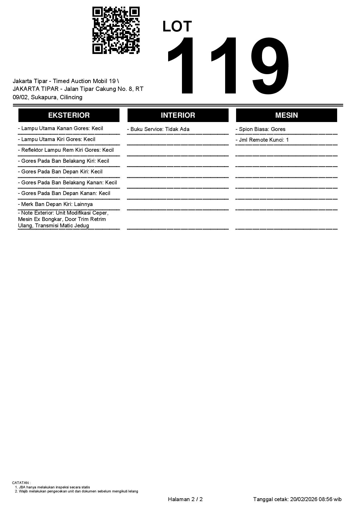 - Kondisi objek lelang dilelang apa adanya, baik kondisi fisik, mesin maupun legalitas kendaraan. Jika terdapat kekurangan/cacat baik yang terlihat maupun yang tidak terlihat, maka semua akan menjadi tanggung jawab/risiko Pemenang Lelang. Oleh karena itu, Pemenang Lelang melepaskan segala hak untuk menuntut dan/atau meminta ganti rugi atas hal tersebut kepada JBA.
