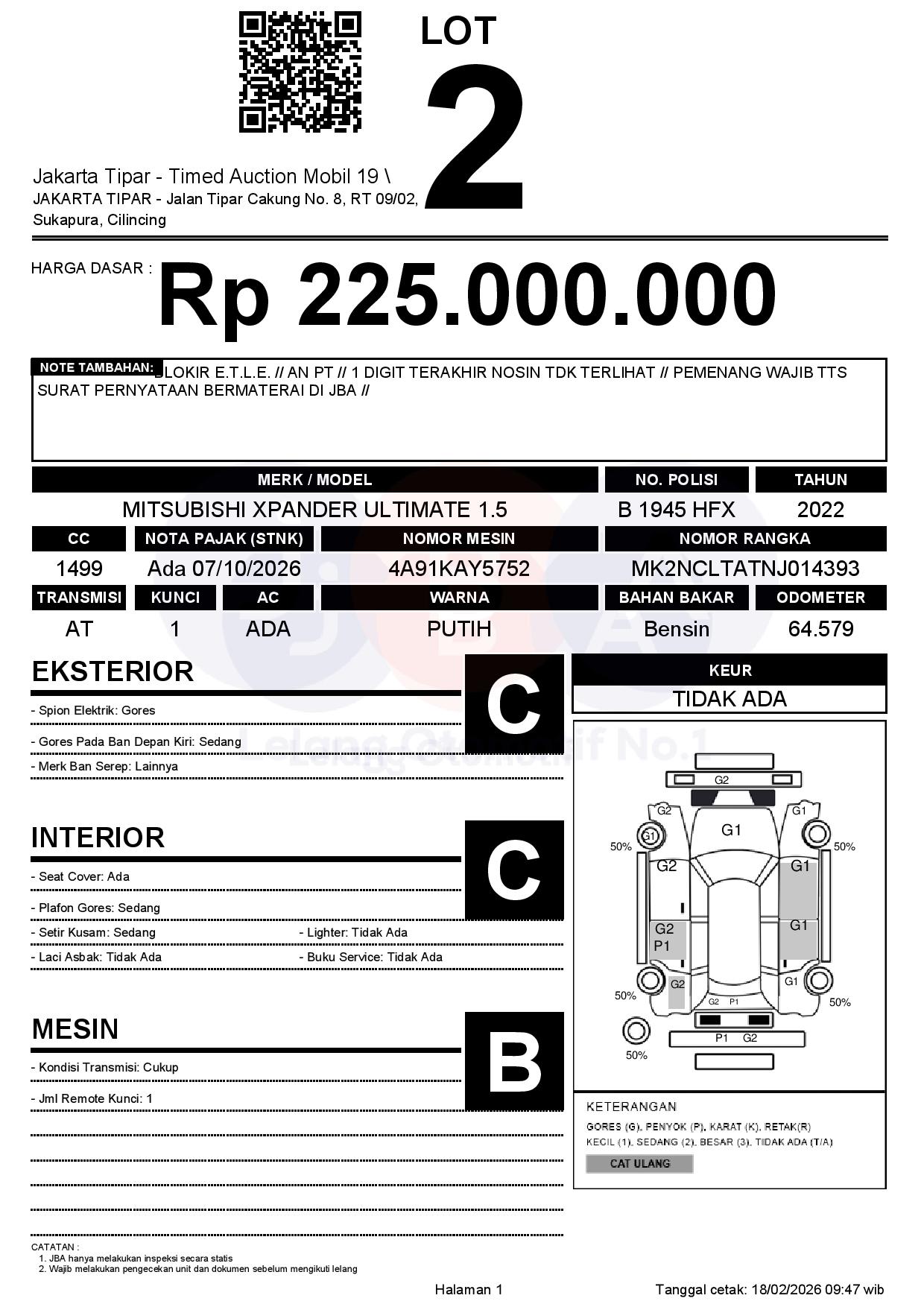 - Kondisi objek lelang dilelang apa adanya, baik kondisi fisik, mesin maupun legalitas kendaraan. Jika terdapat kekurangan/cacat baik yang terlihat maupun yang tidak terlihat, maka semua akan menjadi tanggung jawab/risiko Pemenang Lelang. Oleh karena itu, Pemenang Lelang melepaskan segala hak untuk menuntut dan/atau meminta ganti rugi atas hal tersebut kepada JBA.
