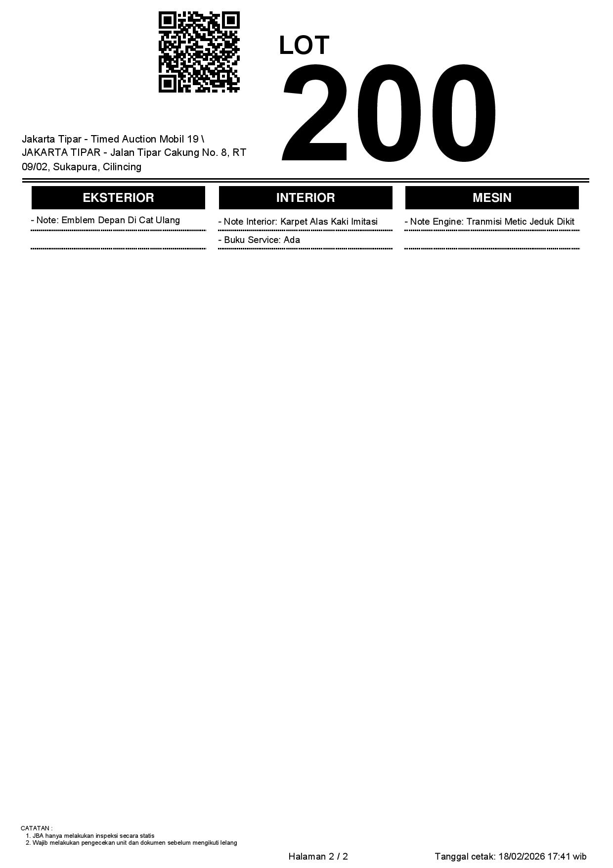 - Kondisi objek lelang dilelang apa adanya, baik kondisi fisik, mesin maupun legalitas kendaraan. Jika terdapat kekurangan/cacat baik yang terlihat maupun yang tidak terlihat, maka semua akan menjadi tanggung jawab/risiko Pemenang Lelang. Oleh karena itu, Pemenang Lelang melepaskan segala hak untuk menuntut dan/atau meminta ganti rugi atas hal tersebut kepada JBA.