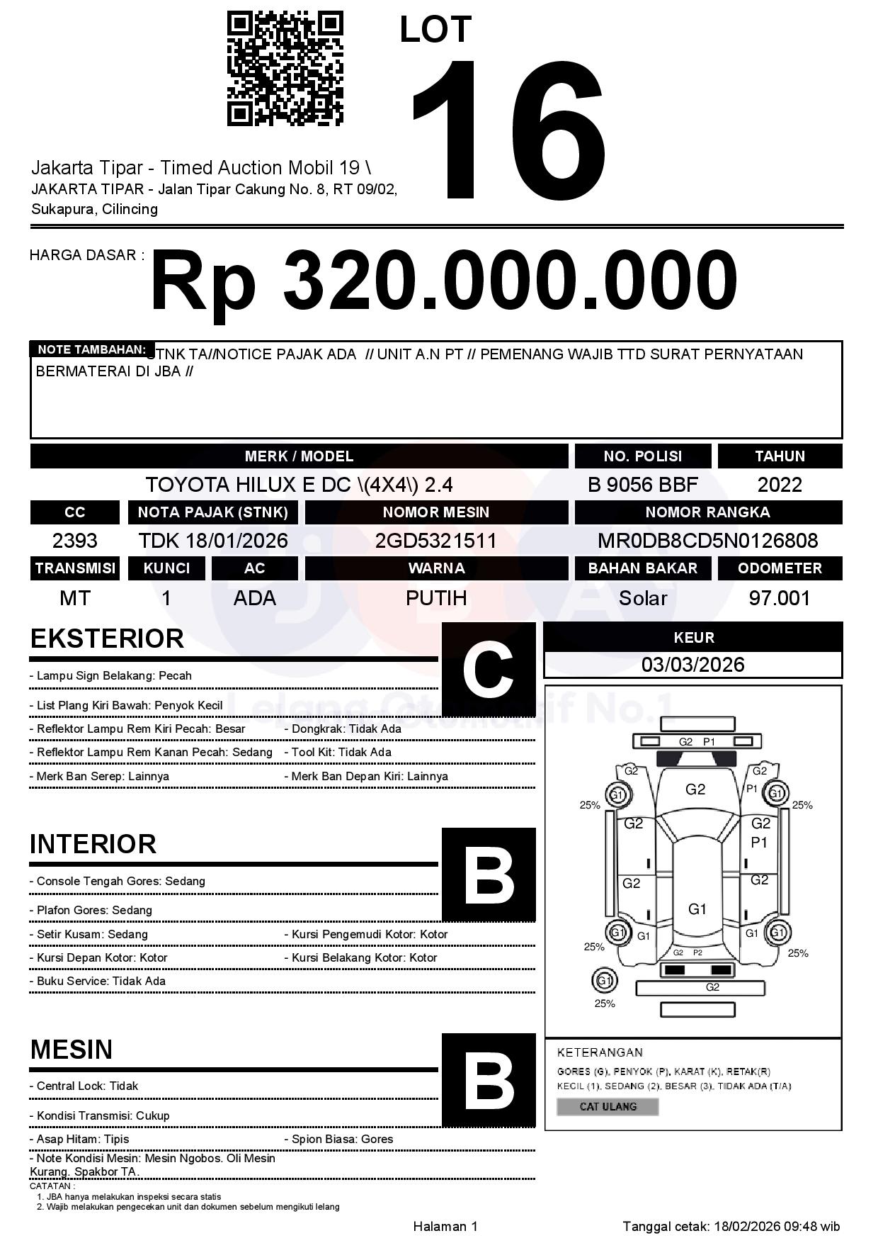 - Kondisi objek lelang dilelang apa adanya, baik kondisi fisik, mesin maupun legalitas kendaraan. Jika terdapat kekurangan/cacat baik yang terlihat maupun yang tidak terlihat, maka semua akan menjadi tanggung jawab/risiko Pemenang Lelang. Oleh karena itu, Pemenang Lelang melepaskan segala hak untuk menuntut dan/atau meminta ganti rugi atas hal tersebut kepada JBA.
