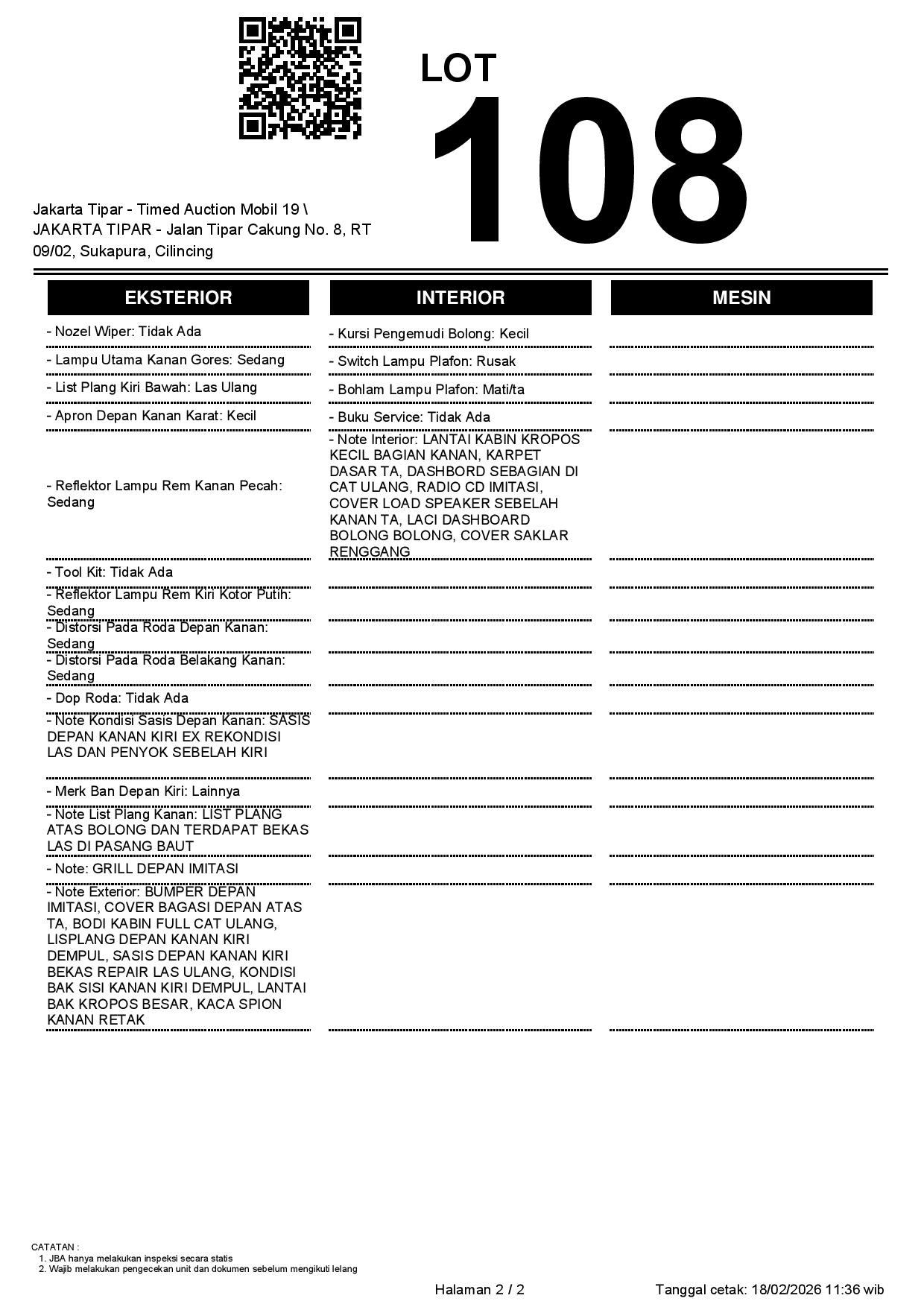 - Kondisi objek lelang dilelang apa adanya, baik kondisi fisik, mesin maupun legalitas kendaraan. Jika terdapat kekurangan/cacat baik yang terlihat maupun yang tidak terlihat, maka semua akan menjadi tanggung jawab/risiko Pemenang Lelang. Oleh karena itu, Pemenang Lelang melepaskan segala hak untuk menuntut dan/atau meminta ganti rugi atas hal tersebut kepada JBA.