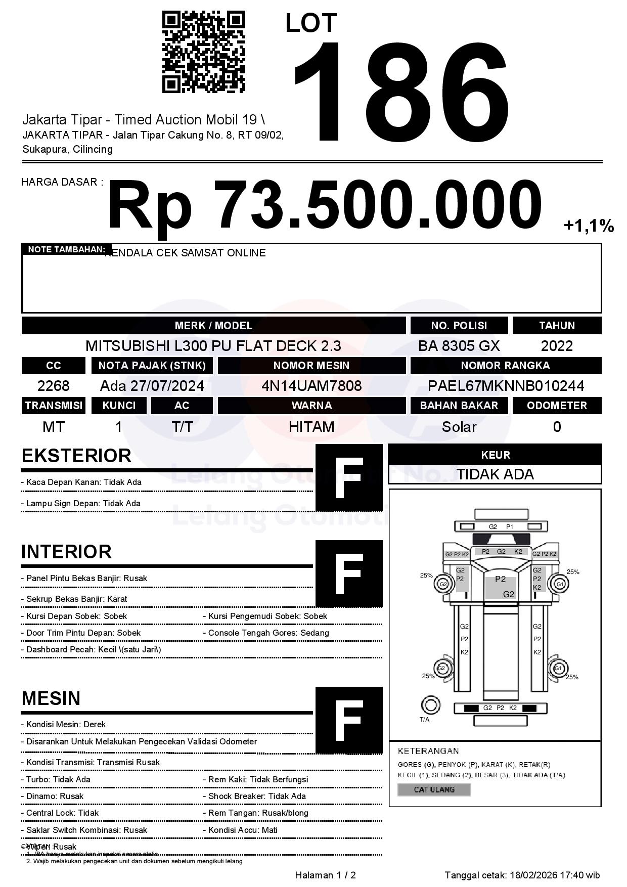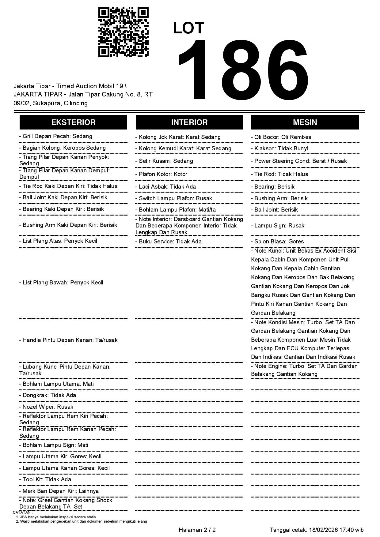 - Kondisi objek lelang dilelang apa adanya, baik kondisi fisik, mesin maupun legalitas kendaraan. Jika terdapat kekurangan/cacat baik yang terlihat maupun yang tidak terlihat, maka semua akan menjadi tanggung jawab/risiko Pemenang Lelang. Oleh karena itu, Pemenang Lelang melepaskan segala hak untuk menuntut dan/atau meminta ganti rugi atas hal tersebut kepada JBA.
