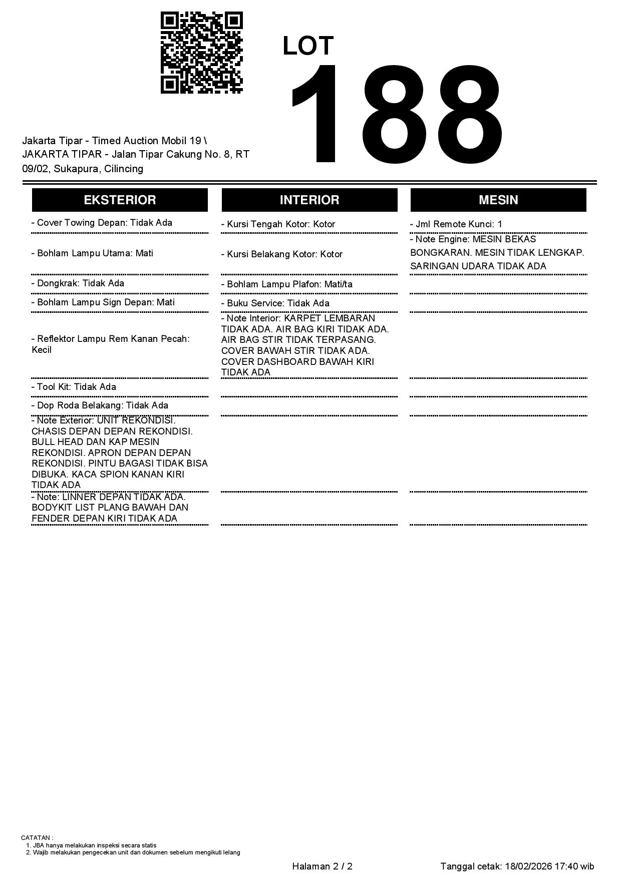 - Kondisi objek lelang dilelang apa adanya, baik kondisi fisik, mesin maupun legalitas kendaraan. Jika terdapat kekurangan/cacat baik yang terlihat maupun yang tidak terlihat, maka semua akan menjadi tanggung jawab/risiko Pemenang Lelang. Oleh karena itu, Pemenang Lelang melepaskan segala hak untuk menuntut dan/atau meminta ganti rugi atas hal tersebut kepada JBA.