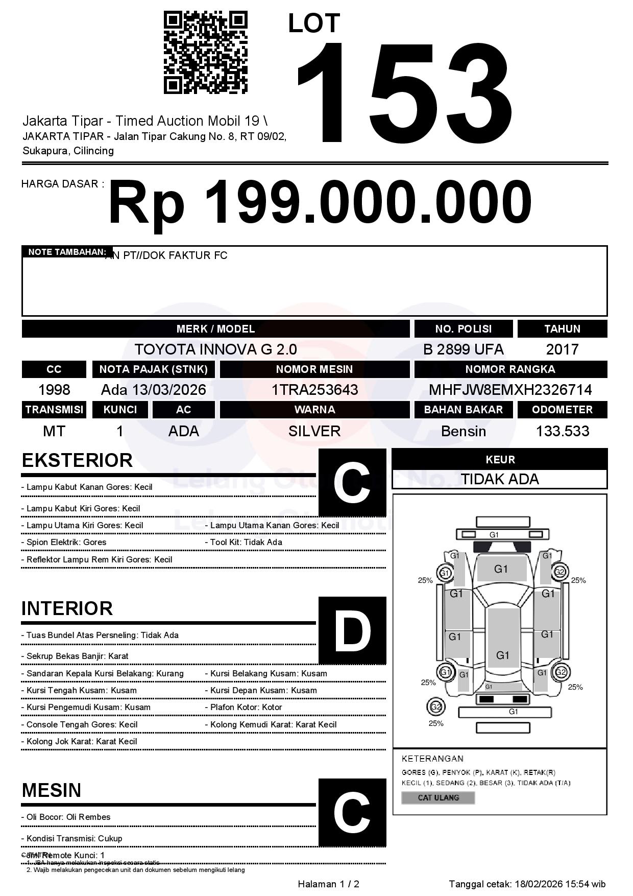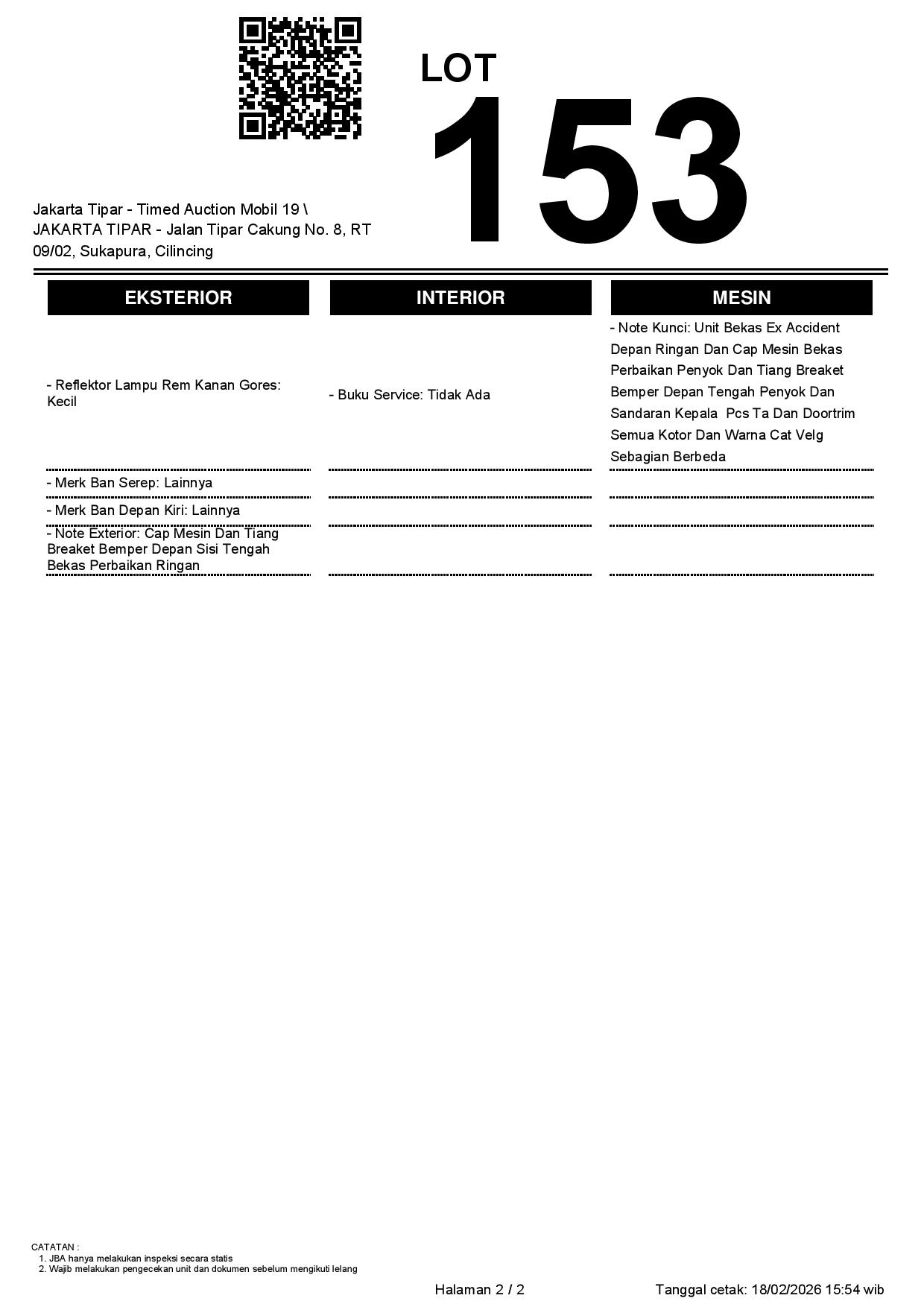 - Kondisi objek lelang dilelang apa adanya, baik kondisi fisik, mesin maupun legalitas kendaraan. Jika terdapat kekurangan/cacat baik yang terlihat maupun yang tidak terlihat, maka semua akan menjadi tanggung jawab/risiko Pemenang Lelang. Oleh karena itu, Pemenang Lelang melepaskan segala hak untuk menuntut dan/atau meminta ganti rugi atas hal tersebut kepada JBA.
