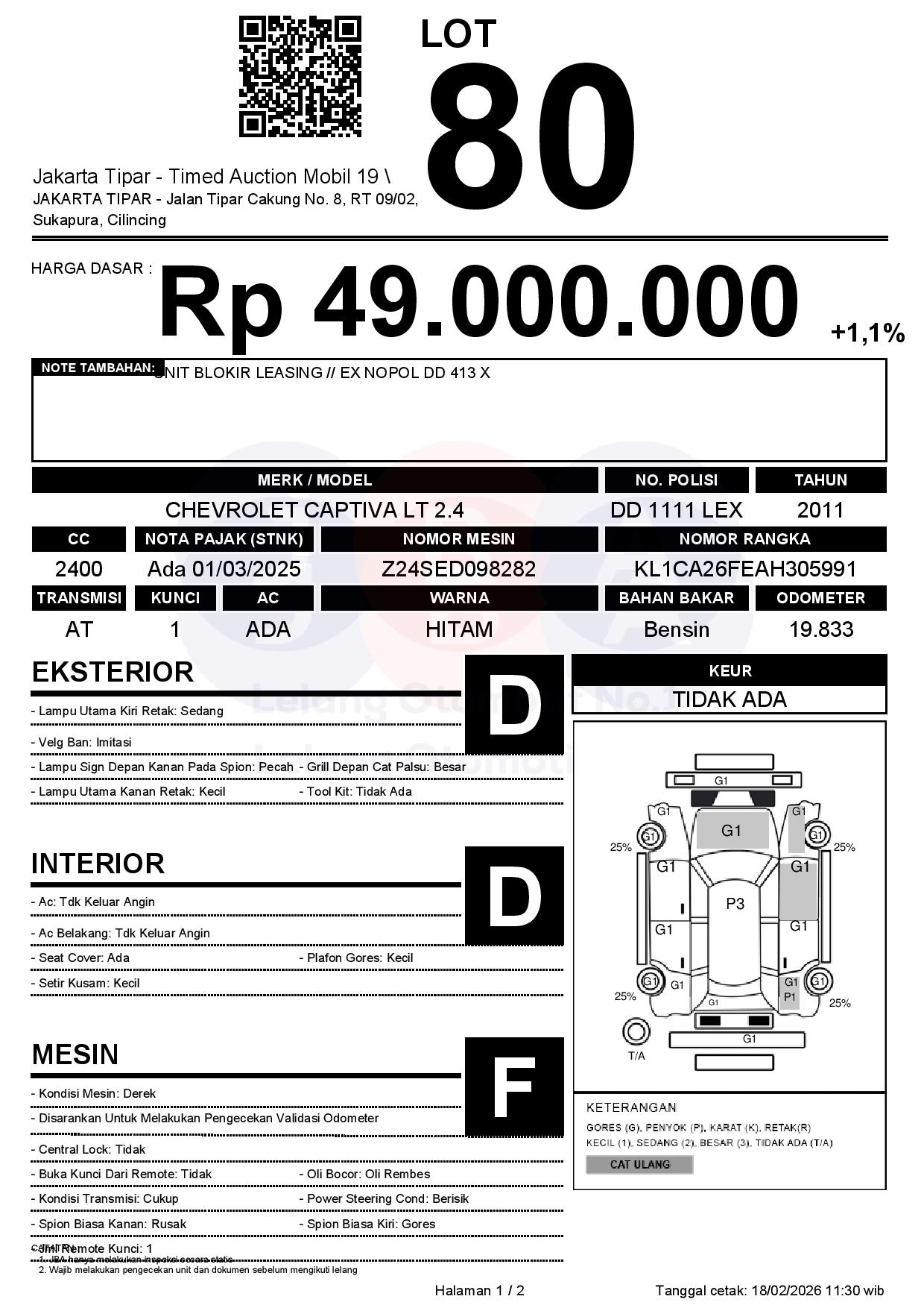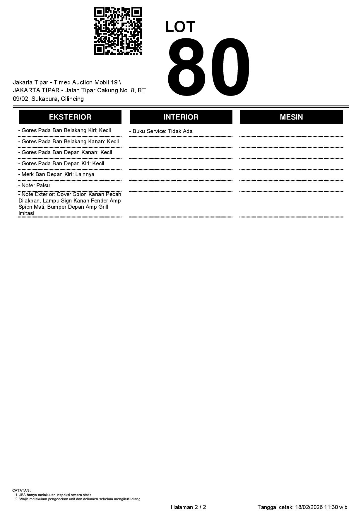 - Kondisi objek lelang dilelang apa adanya, baik kondisi fisik, mesin maupun legalitas kendaraan. Jika terdapat kekurangan/cacat baik yang terlihat maupun yang tidak terlihat, maka semua akan menjadi tanggung jawab/risiko Pemenang Lelang. Oleh karena itu, Pemenang Lelang melepaskan segala hak untuk menuntut dan/atau meminta ganti rugi atas hal tersebut kepada JBA.