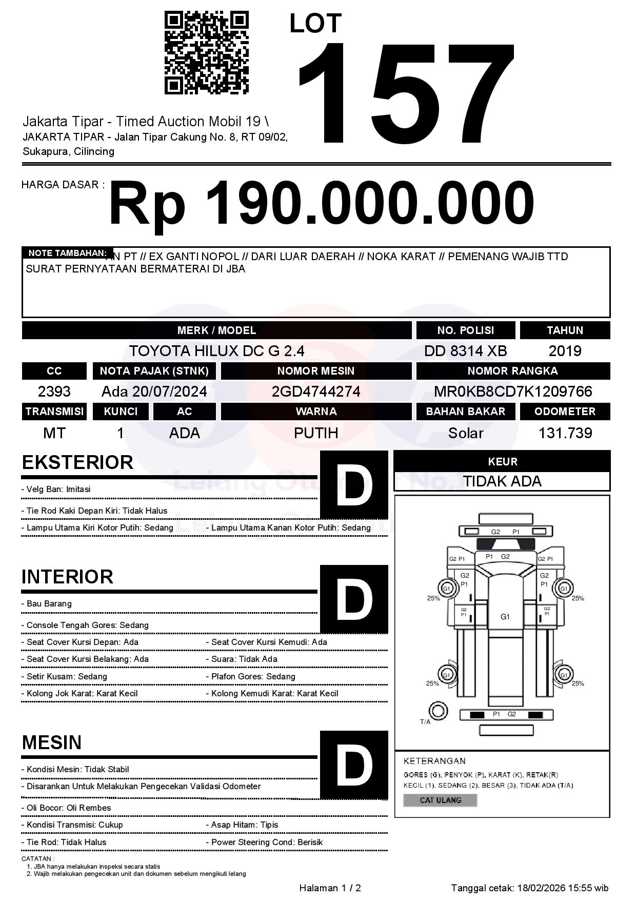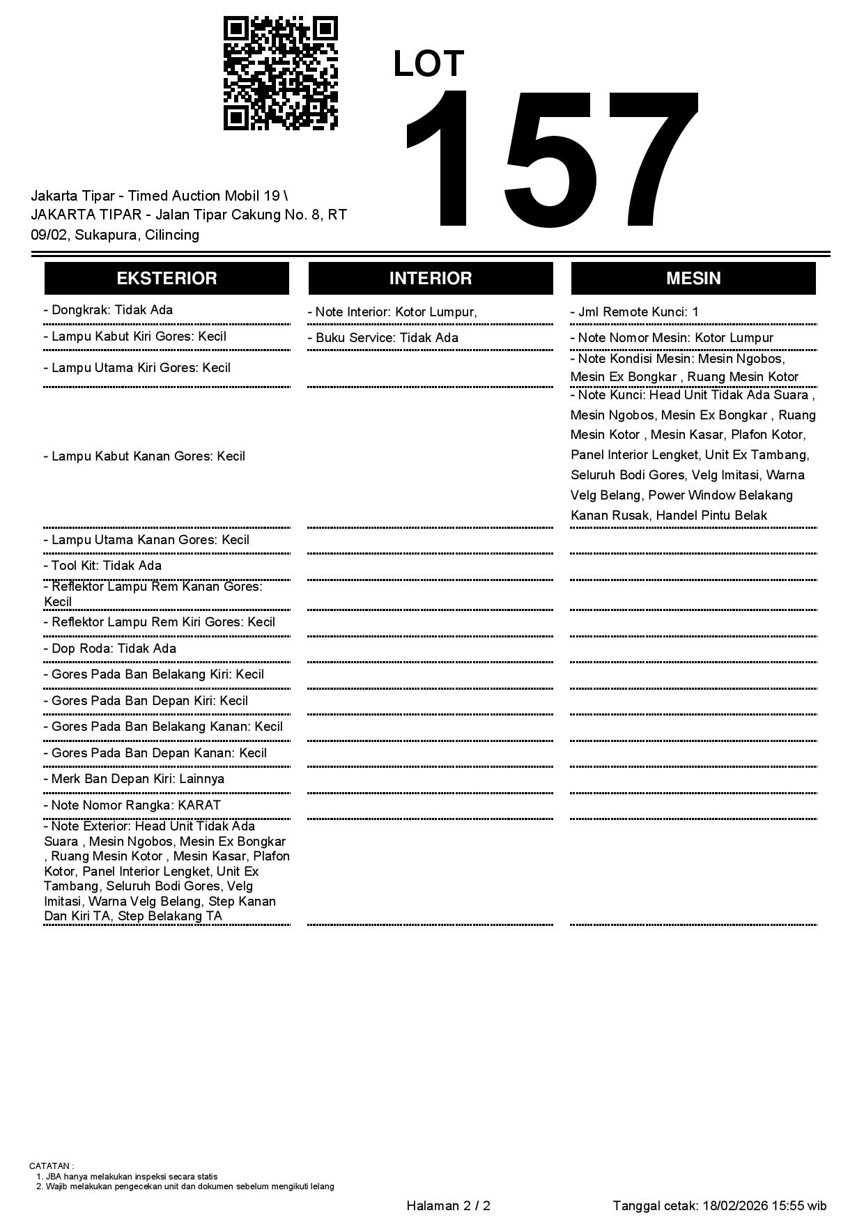 - Kondisi objek lelang dilelang apa adanya, baik kondisi fisik, mesin maupun legalitas kendaraan. Jika terdapat kekurangan/cacat baik yang terlihat maupun yang tidak terlihat, maka semua akan menjadi tanggung jawab/risiko Pemenang Lelang. Oleh karena itu, Pemenang Lelang melepaskan segala hak untuk menuntut dan/atau meminta ganti rugi atas hal tersebut kepada JBA.