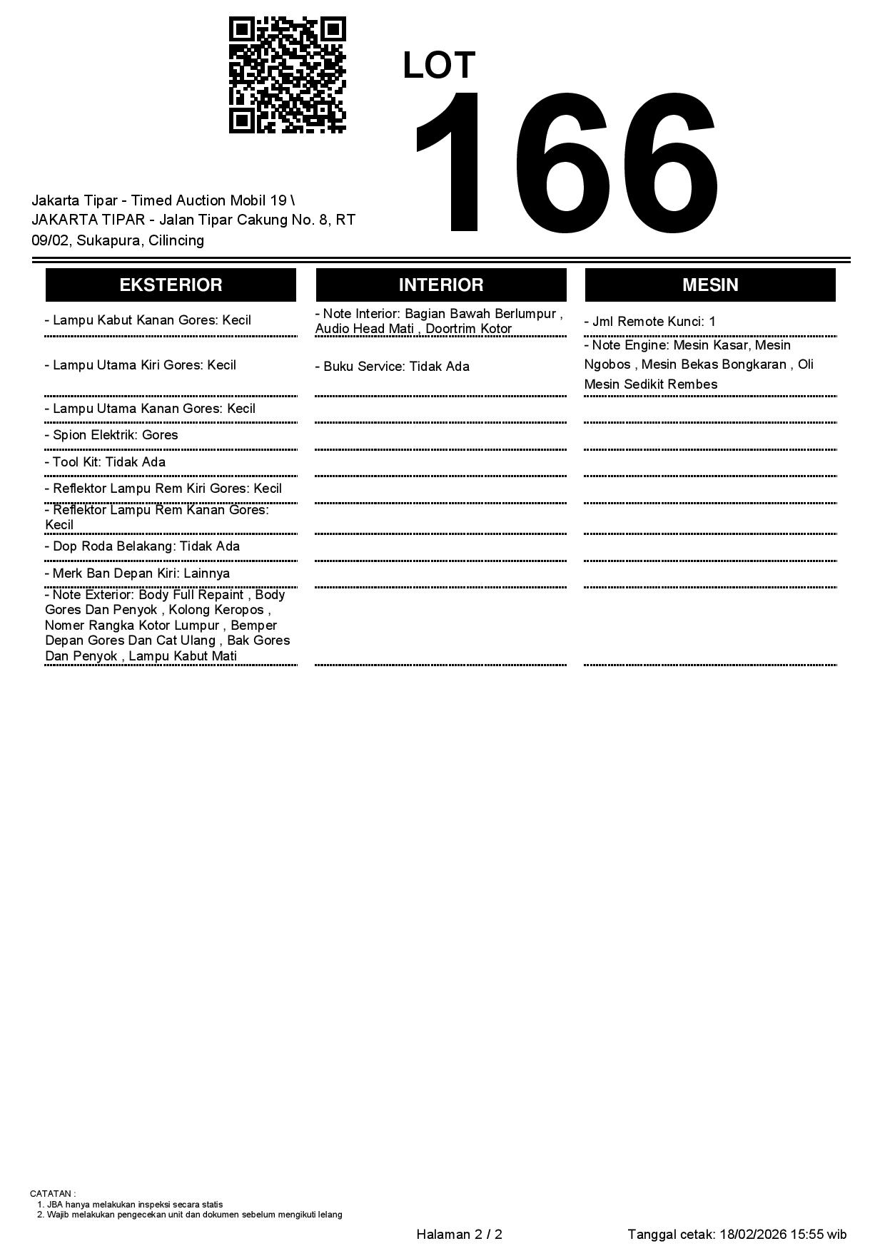 - Kondisi objek lelang dilelang apa adanya, baik kondisi fisik, mesin maupun legalitas kendaraan. Jika terdapat kekurangan/cacat baik yang terlihat maupun yang tidak terlihat, maka semua akan menjadi tanggung jawab/risiko Pemenang Lelang. Oleh karena itu, Pemenang Lelang melepaskan segala hak untuk menuntut dan/atau meminta ganti rugi atas hal tersebut kepada JBA.