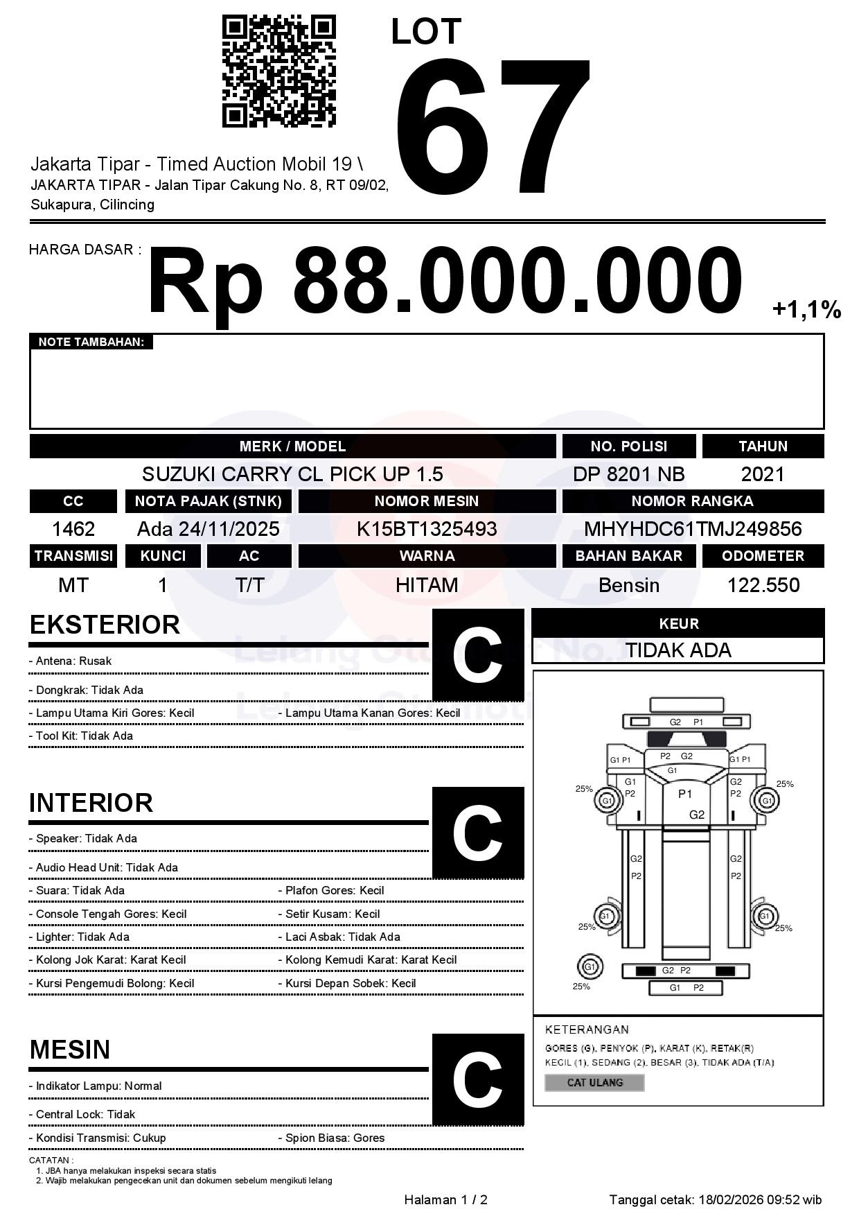 - Kondisi objek lelang dilelang apa adanya, baik kondisi fisik, mesin maupun legalitas kendaraan. Jika terdapat kekurangan/cacat baik yang terlihat maupun yang tidak terlihat, maka semua akan menjadi tanggung jawab/risiko Pemenang Lelang. Oleh karena itu, Pemenang Lelang melepaskan segala hak untuk menuntut dan/atau meminta ganti rugi atas hal tersebut kepada JBA.