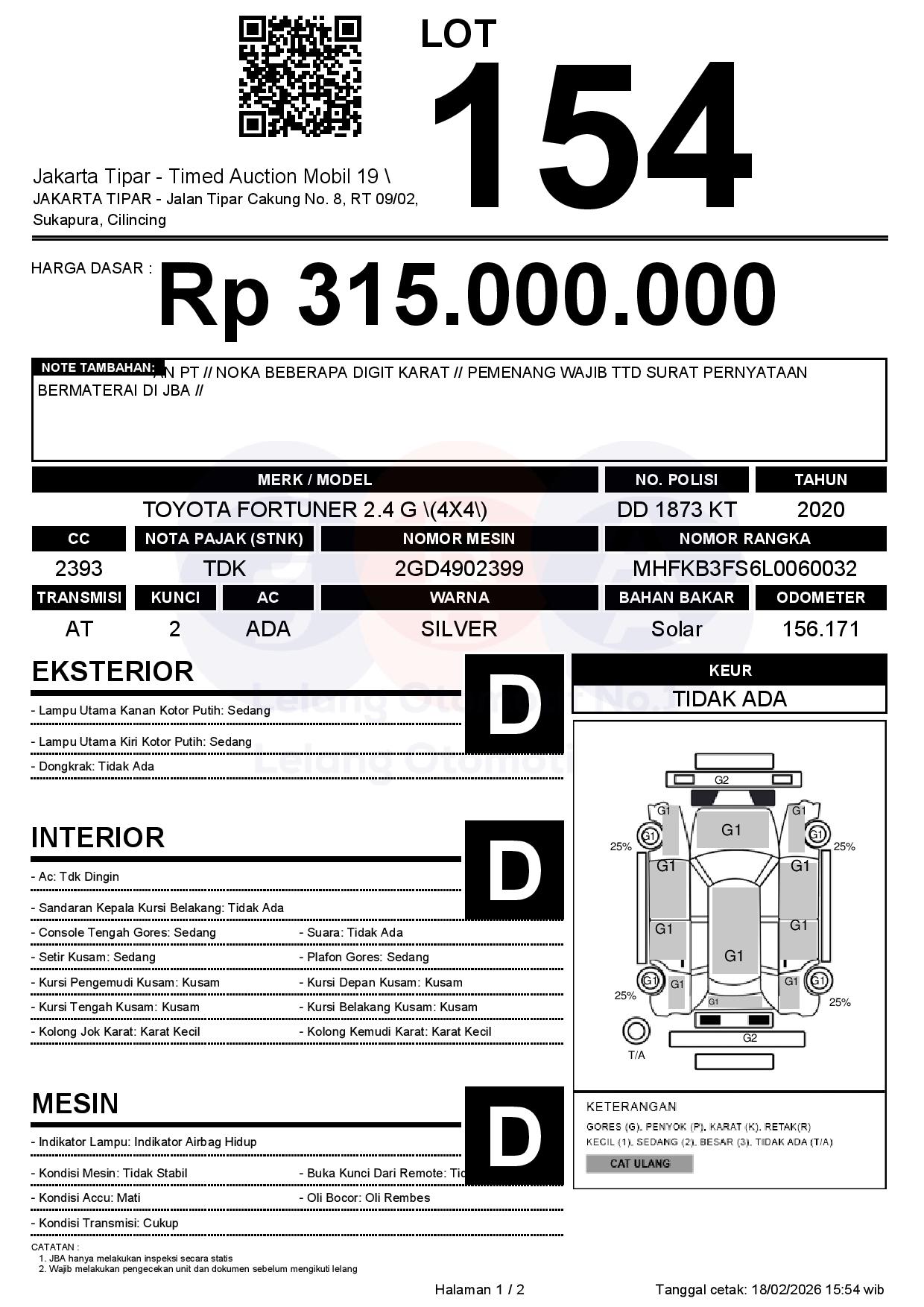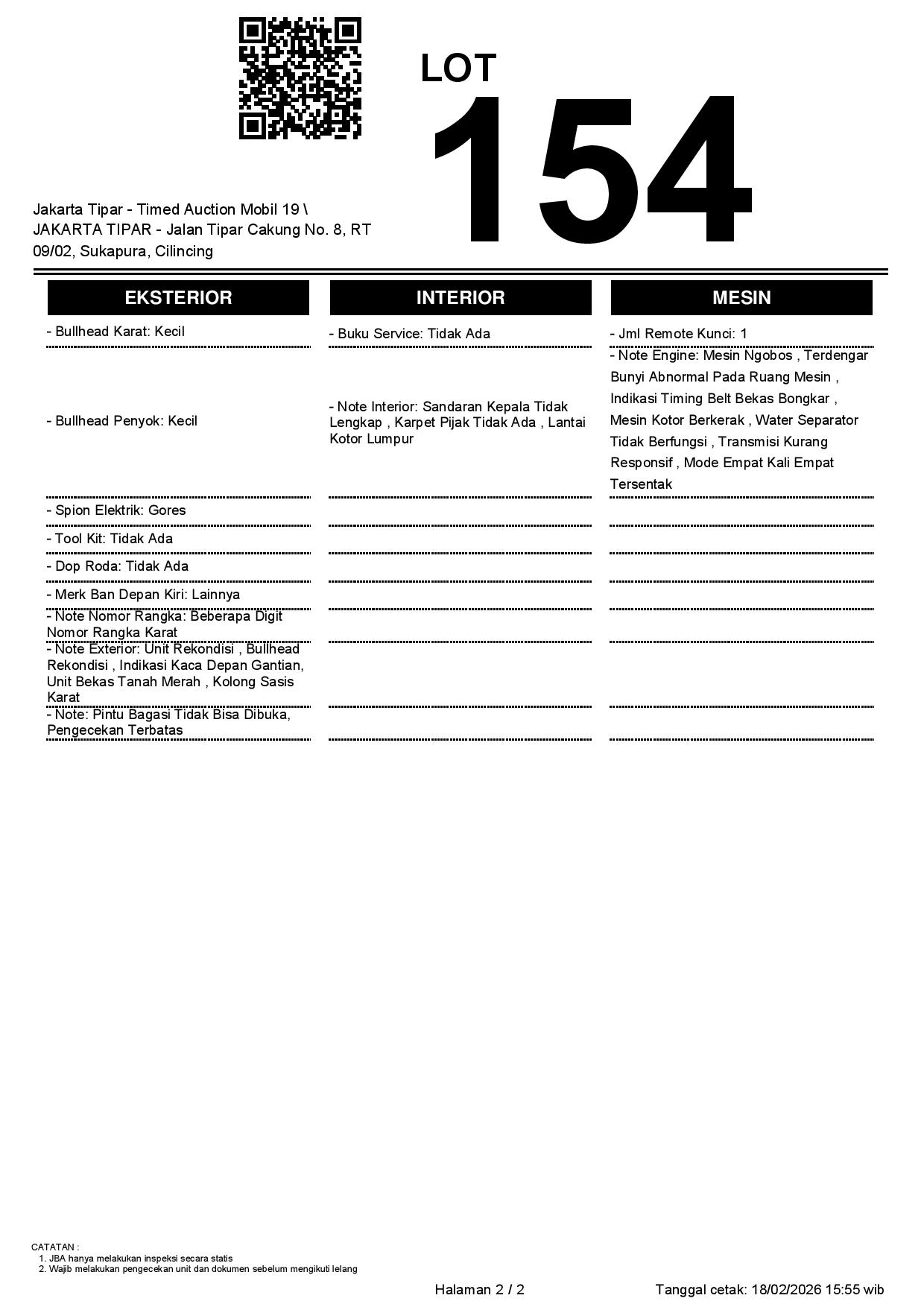 - Kondisi objek lelang dilelang apa adanya, baik kondisi fisik, mesin maupun legalitas kendaraan. Jika terdapat kekurangan/cacat baik yang terlihat maupun yang tidak terlihat, maka semua akan menjadi tanggung jawab/risiko Pemenang Lelang. Oleh karena itu, Pemenang Lelang melepaskan segala hak untuk menuntut dan/atau meminta ganti rugi atas hal tersebut kepada JBA.