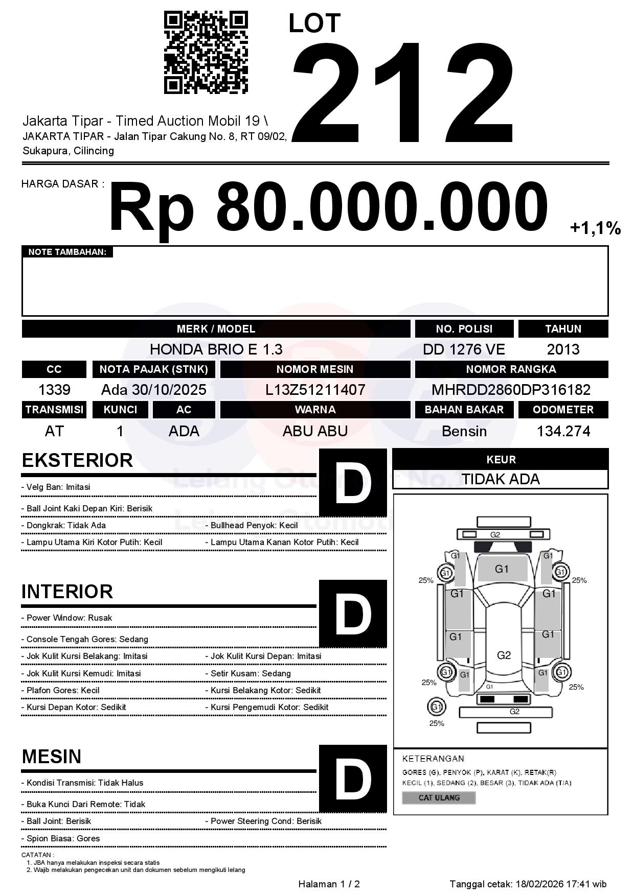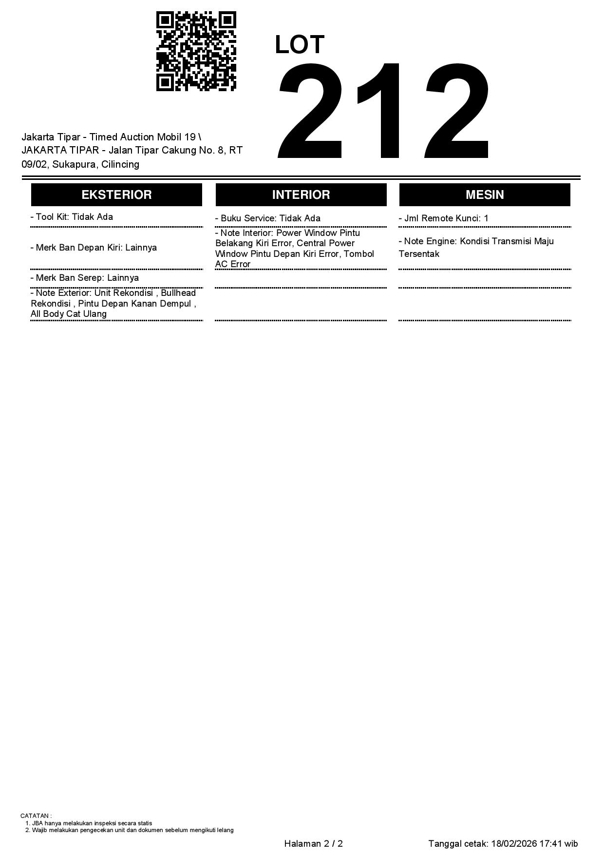 - Kondisi objek lelang dilelang apa adanya, baik kondisi fisik, mesin maupun legalitas kendaraan. Jika terdapat kekurangan/cacat baik yang terlihat maupun yang tidak terlihat, maka semua akan menjadi tanggung jawab/risiko Pemenang Lelang. Oleh karena itu, Pemenang Lelang melepaskan segala hak untuk menuntut dan/atau meminta ganti rugi atas hal tersebut kepada JBA.