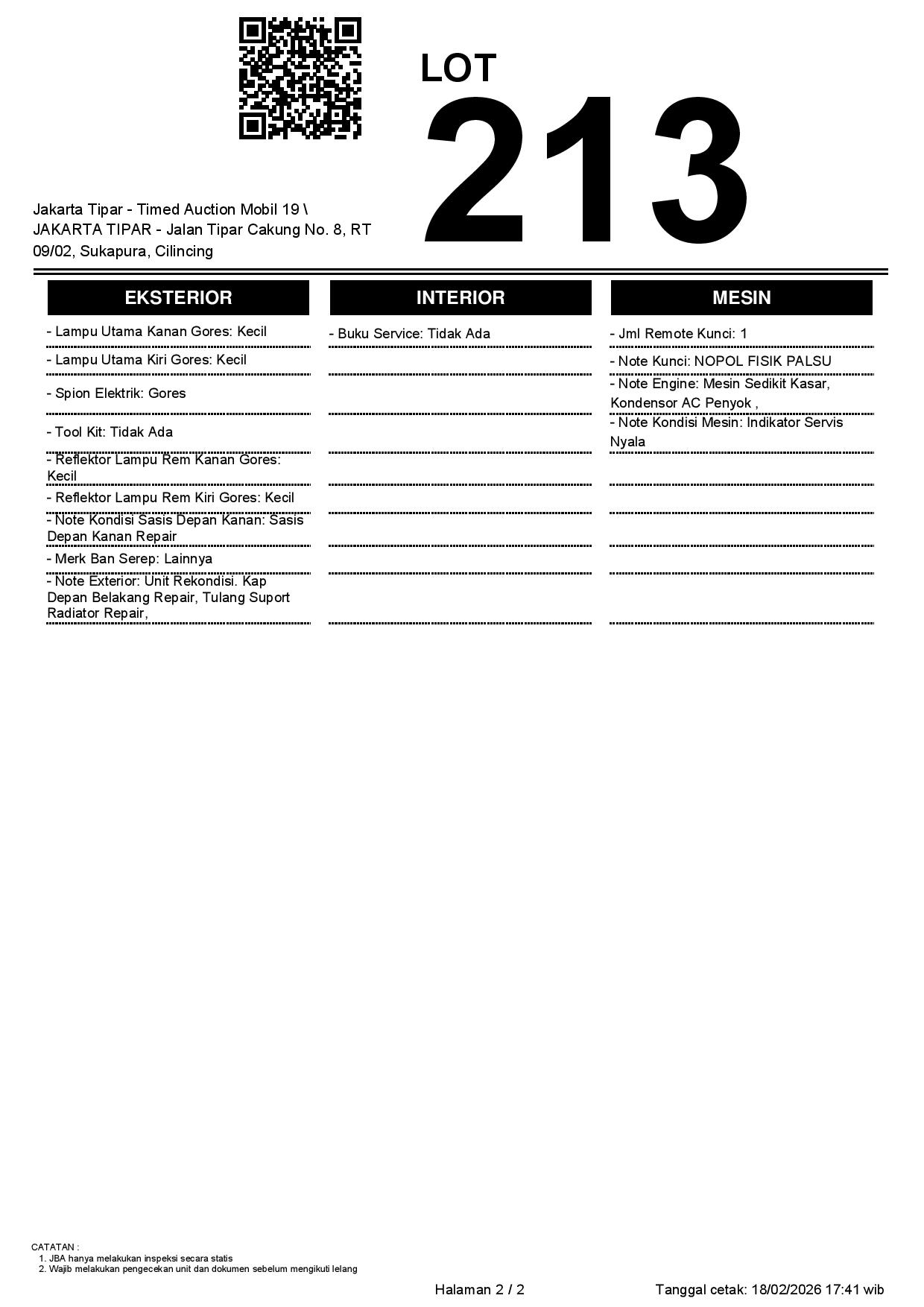 - Kondisi objek lelang dilelang apa adanya, baik kondisi fisik, mesin maupun legalitas kendaraan. Jika terdapat kekurangan/cacat baik yang terlihat maupun yang tidak terlihat, maka semua akan menjadi tanggung jawab/risiko Pemenang Lelang. Oleh karena itu, Pemenang Lelang melepaskan segala hak untuk menuntut dan/atau meminta ganti rugi atas hal tersebut kepada JBA.