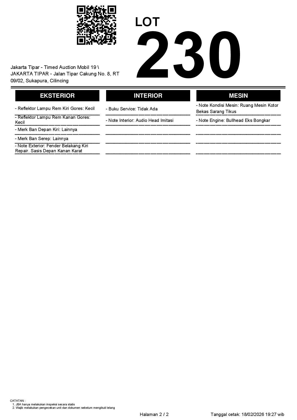 - Kondisi objek lelang dilelang apa adanya, baik kondisi fisik, mesin maupun legalitas kendaraan. Jika terdapat kekurangan/cacat baik yang terlihat maupun yang tidak terlihat, maka semua akan menjadi tanggung jawab/risiko Pemenang Lelang. Oleh karena itu, Pemenang Lelang melepaskan segala hak untuk menuntut dan/atau meminta ganti rugi atas hal tersebut kepada JBA.