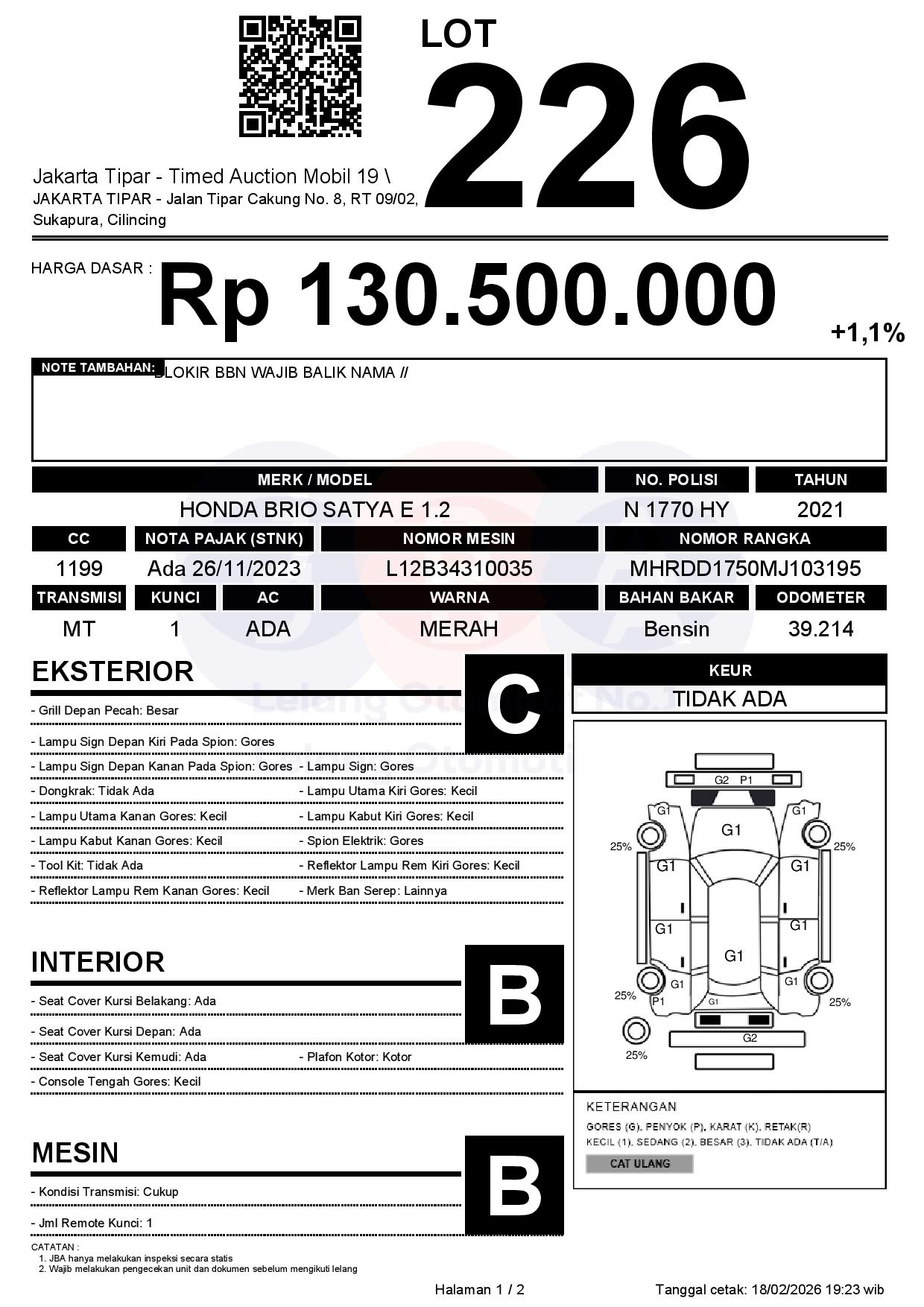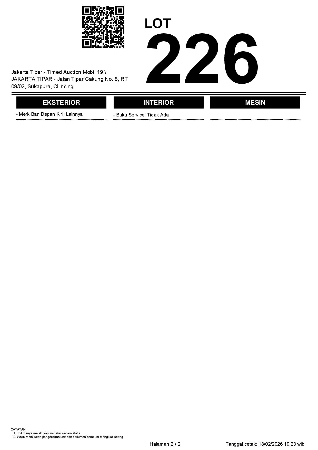 - Kondisi objek lelang dilelang apa adanya, baik kondisi fisik, mesin maupun legalitas kendaraan. Jika terdapat kekurangan/cacat baik yang terlihat maupun yang tidak terlihat, maka semua akan menjadi tanggung jawab/risiko Pemenang Lelang. Oleh karena itu, Pemenang Lelang melepaskan segala hak untuk menuntut dan/atau meminta ganti rugi atas hal tersebut kepada JBA.