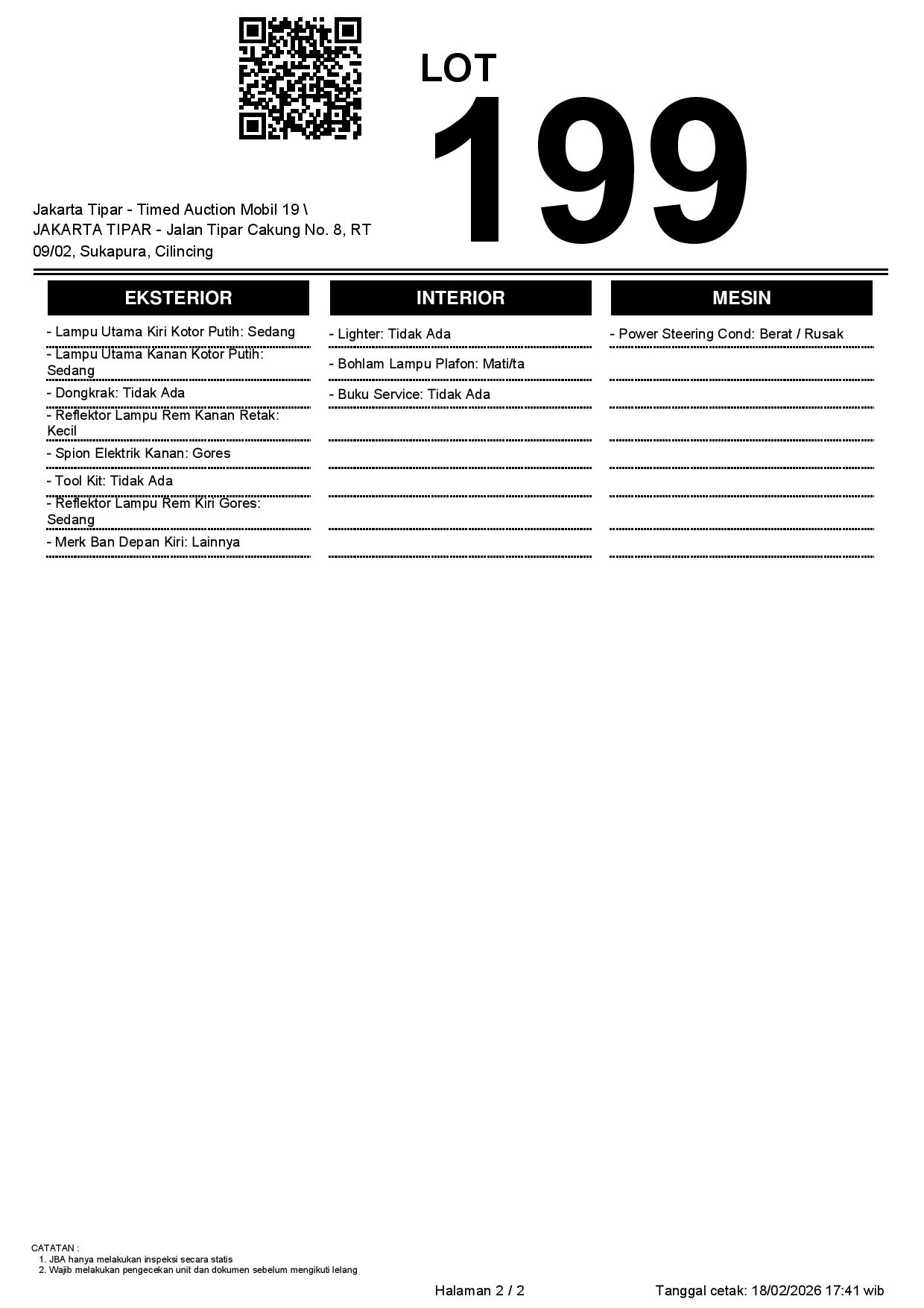 - Kondisi objek lelang dilelang apa adanya, baik kondisi fisik, mesin maupun legalitas kendaraan. Jika terdapat kekurangan/cacat baik yang terlihat maupun yang tidak terlihat, maka semua akan menjadi tanggung jawab/risiko Pemenang Lelang. Oleh karena itu, Pemenang Lelang melepaskan segala hak untuk menuntut dan/atau meminta ganti rugi atas hal tersebut kepada JBA.