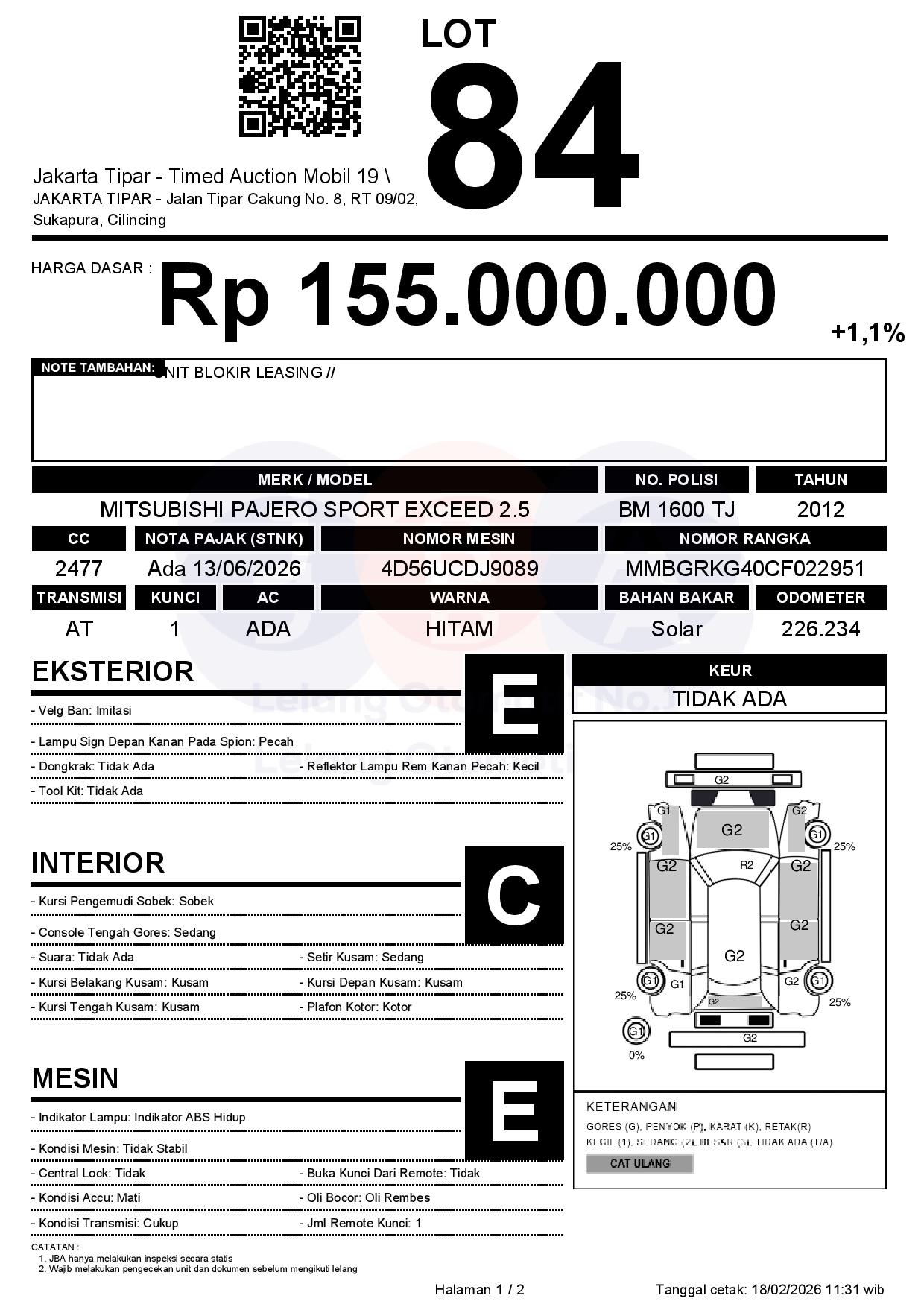 - Kondisi objek lelang dilelang apa adanya, baik kondisi fisik, mesin maupun legalitas kendaraan. Jika terdapat kekurangan/cacat baik yang terlihat maupun yang tidak terlihat, maka semua akan menjadi tanggung jawab/risiko Pemenang Lelang. Oleh karena itu, Pemenang Lelang melepaskan segala hak untuk menuntut dan/atau meminta ganti rugi atas hal tersebut kepada JBA.