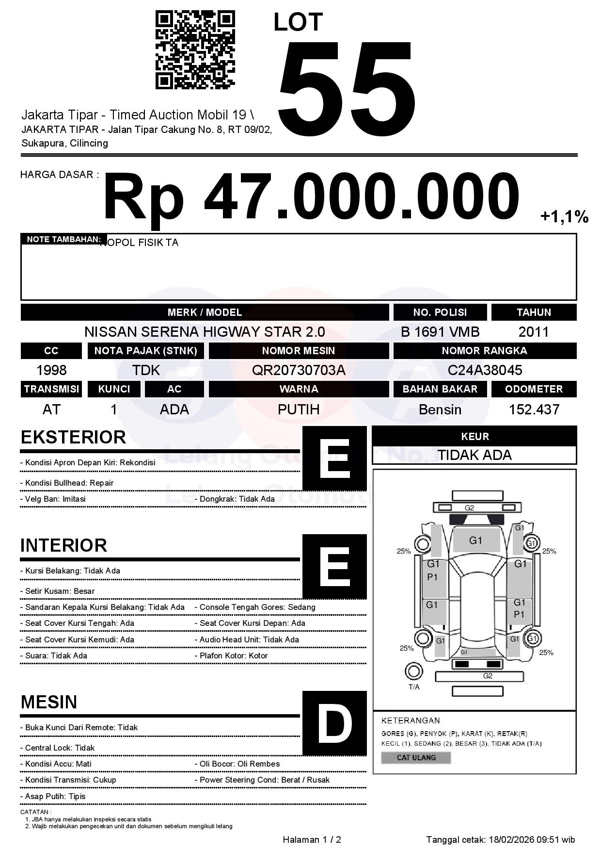 - Kondisi objek lelang dilelang apa adanya, baik kondisi fisik, mesin maupun legalitas kendaraan. Jika terdapat kekurangan/cacat baik yang terlihat maupun yang tidak terlihat, maka semua akan menjadi tanggung jawab/risiko Pemenang Lelang. Oleh karena itu, Pemenang Lelang melepaskan segala hak untuk menuntut dan/atau meminta ganti rugi atas hal tersebut kepada JBA.