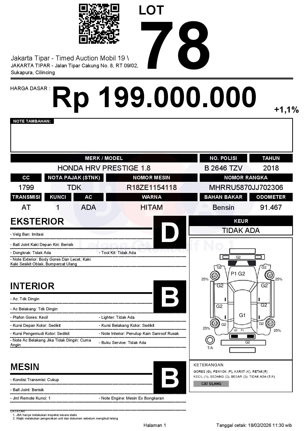 - Kondisi objek lelang dilelang apa adanya, baik kondisi fisik, mesin maupun legalitas kendaraan. Jika terdapat kekurangan/cacat baik yang terlihat maupun yang tidak terlihat, maka semua akan menjadi tanggung jawab/risiko Pemenang Lelang. Oleh karena itu, Pemenang Lelang melepaskan segala hak untuk menuntut dan/atau meminta ganti rugi atas hal tersebut kepada JBA.