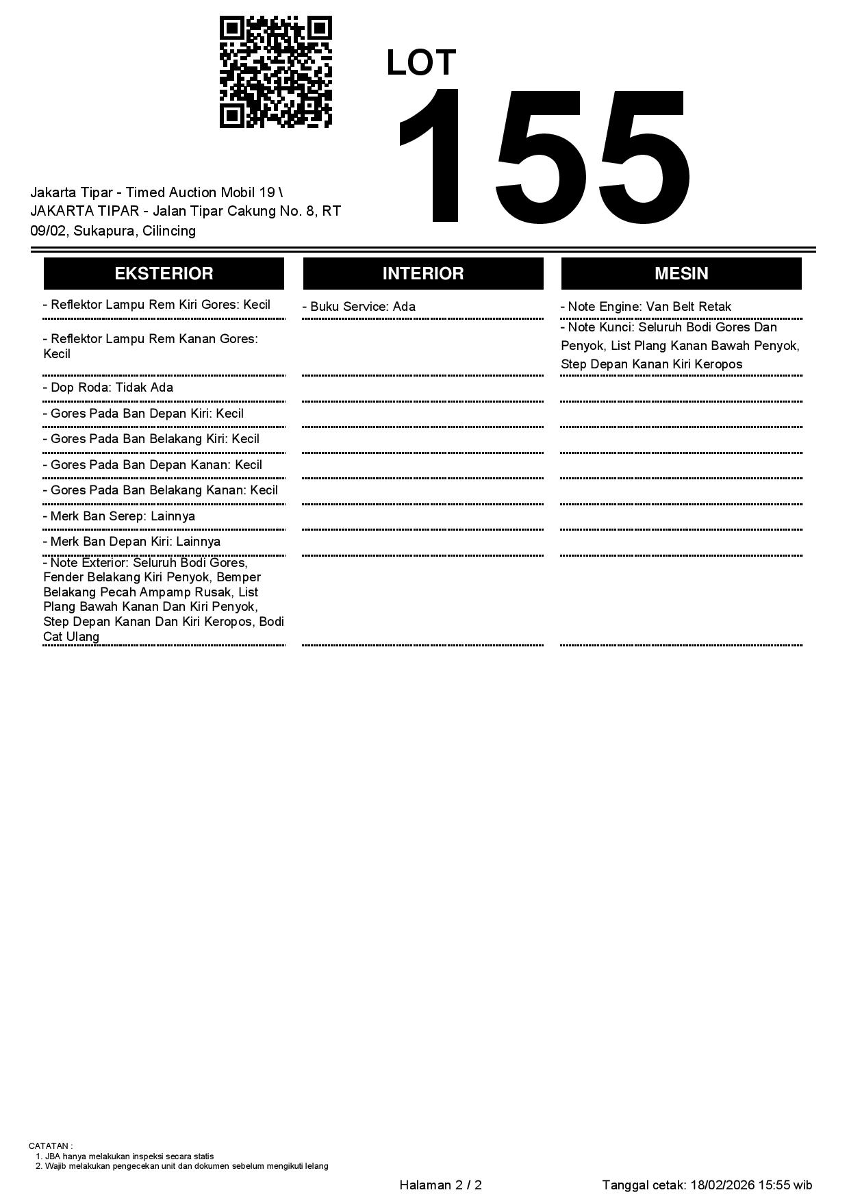 - Kondisi objek lelang dilelang apa adanya, baik kondisi fisik, mesin maupun legalitas kendaraan. Jika terdapat kekurangan/cacat baik yang terlihat maupun yang tidak terlihat, maka semua akan menjadi tanggung jawab/risiko Pemenang Lelang. Oleh karena itu, Pemenang Lelang melepaskan segala hak untuk menuntut dan/atau meminta ganti rugi atas hal tersebut kepada JBA.