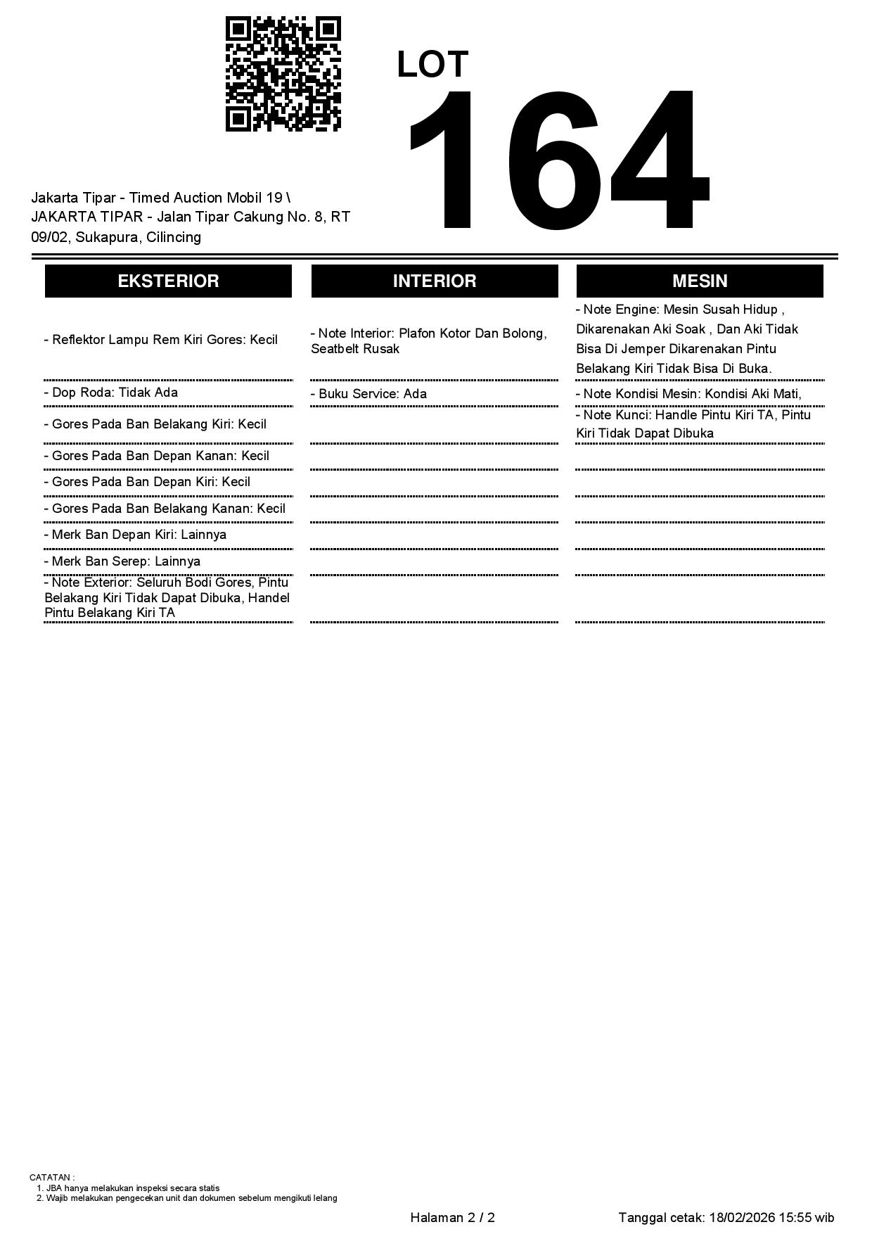 - Kondisi objek lelang dilelang apa adanya, baik kondisi fisik, mesin maupun legalitas kendaraan. Jika terdapat kekurangan/cacat baik yang terlihat maupun yang tidak terlihat, maka semua akan menjadi tanggung jawab/risiko Pemenang Lelang. Oleh karena itu, Pemenang Lelang melepaskan segala hak untuk menuntut dan/atau meminta ganti rugi atas hal tersebut kepada JBA.