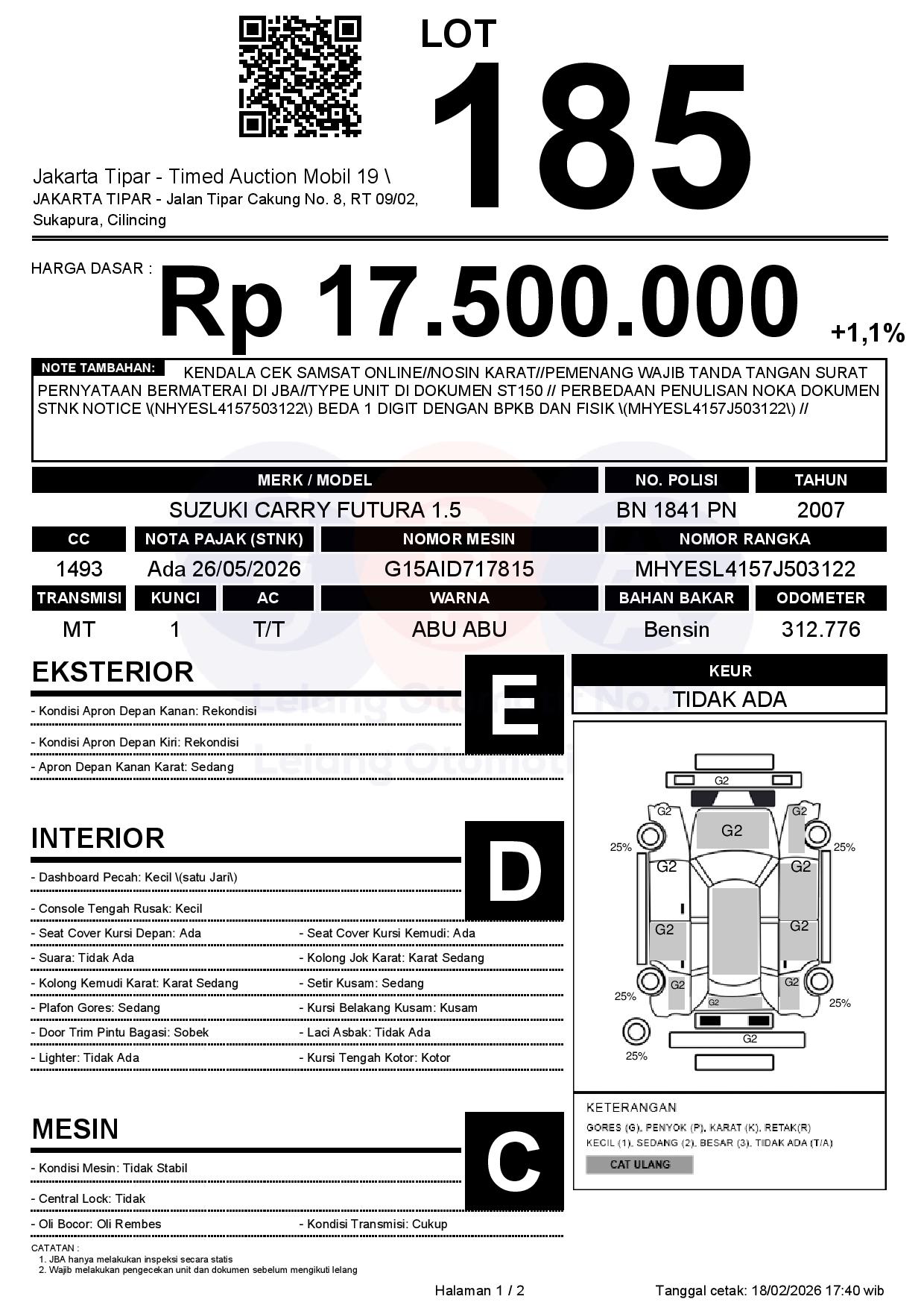 - Kondisi objek lelang dilelang apa adanya, baik kondisi fisik, mesin maupun legalitas kendaraan. Jika terdapat kekurangan/cacat baik yang terlihat maupun yang tidak terlihat, maka semua akan menjadi tanggung jawab/risiko Pemenang Lelang. Oleh karena itu, Pemenang Lelang melepaskan segala hak untuk menuntut dan/atau meminta ganti rugi atas hal tersebut kepada JBA.