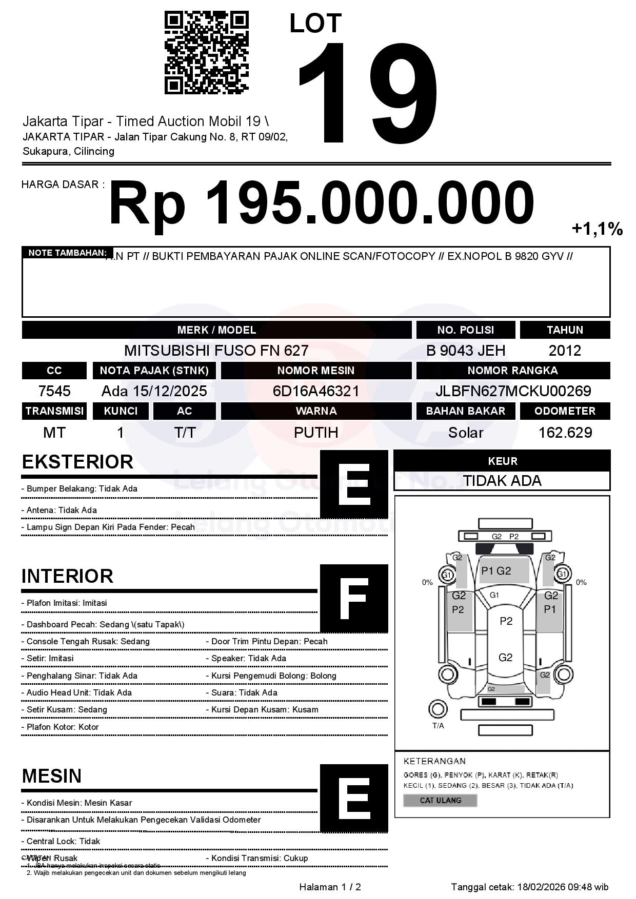 - Kondisi objek lelang dilelang apa adanya, baik kondisi fisik, mesin maupun legalitas kendaraan. Jika terdapat kekurangan/cacat baik yang terlihat maupun yang tidak terlihat, maka semua akan menjadi tanggung jawab/risiko Pemenang Lelang. Oleh karena itu, Pemenang Lelang melepaskan segala hak untuk menuntut dan/atau meminta ganti rugi atas hal tersebut kepada JBA.