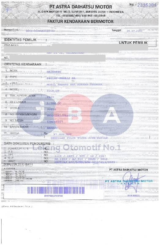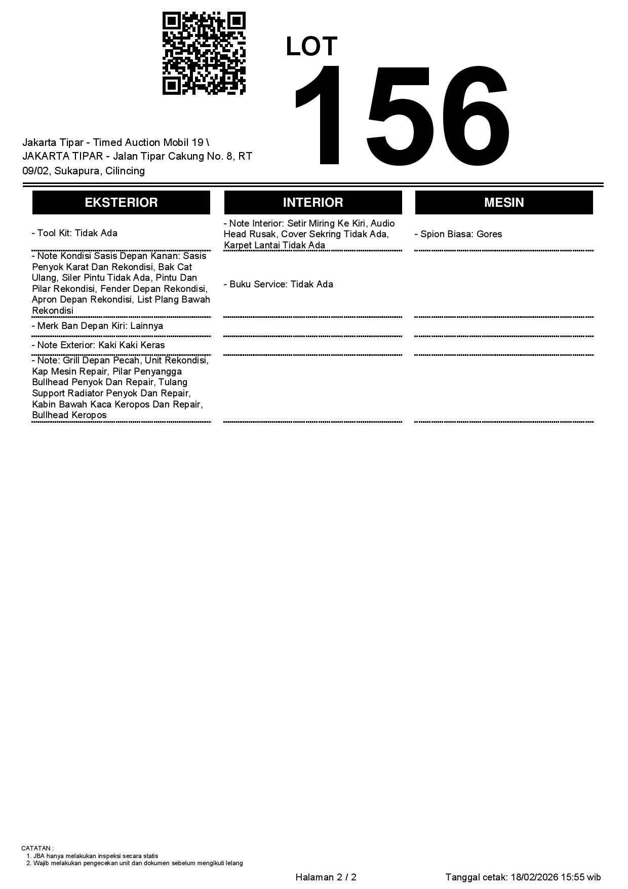 - Kondisi objek lelang dilelang apa adanya, baik kondisi fisik, mesin maupun legalitas kendaraan. Jika terdapat kekurangan/cacat baik yang terlihat maupun yang tidak terlihat, maka semua akan menjadi tanggung jawab/risiko Pemenang Lelang. Oleh karena itu, Pemenang Lelang melepaskan segala hak untuk menuntut dan/atau meminta ganti rugi atas hal tersebut kepada JBA.