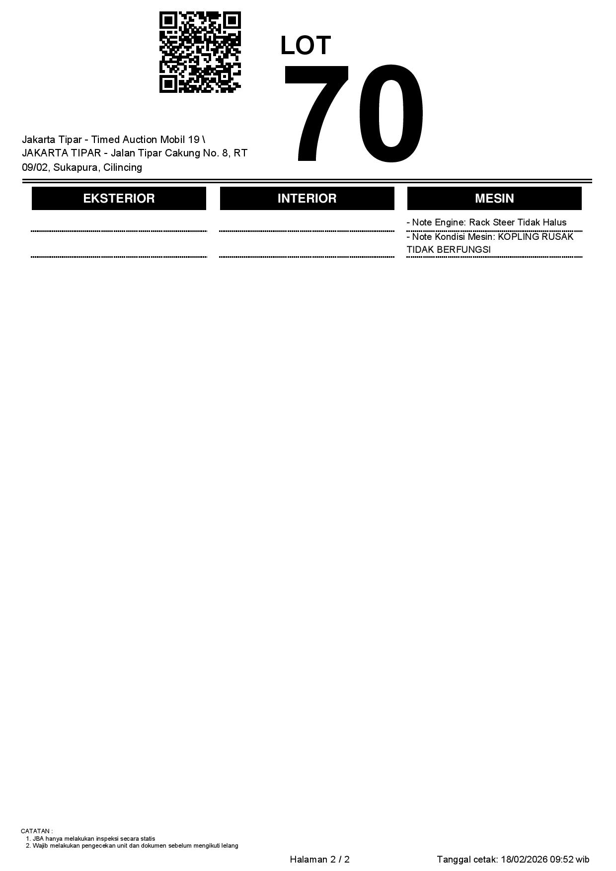 - Kondisi objek lelang dilelang apa adanya, baik kondisi fisik, mesin maupun legalitas kendaraan. Jika terdapat kekurangan/cacat baik yang terlihat maupun yang tidak terlihat, maka semua akan menjadi tanggung jawab/risiko Pemenang Lelang. Oleh karena itu, Pemenang Lelang melepaskan segala hak untuk menuntut dan/atau meminta ganti rugi atas hal tersebut kepada JBA.
