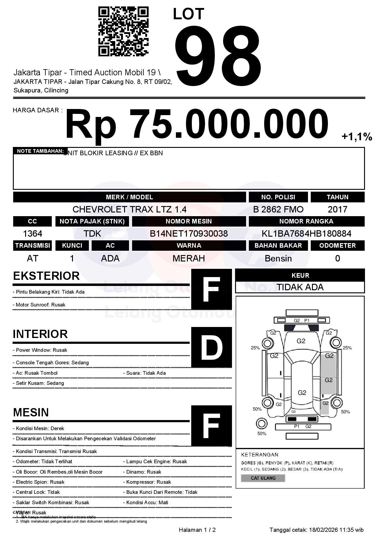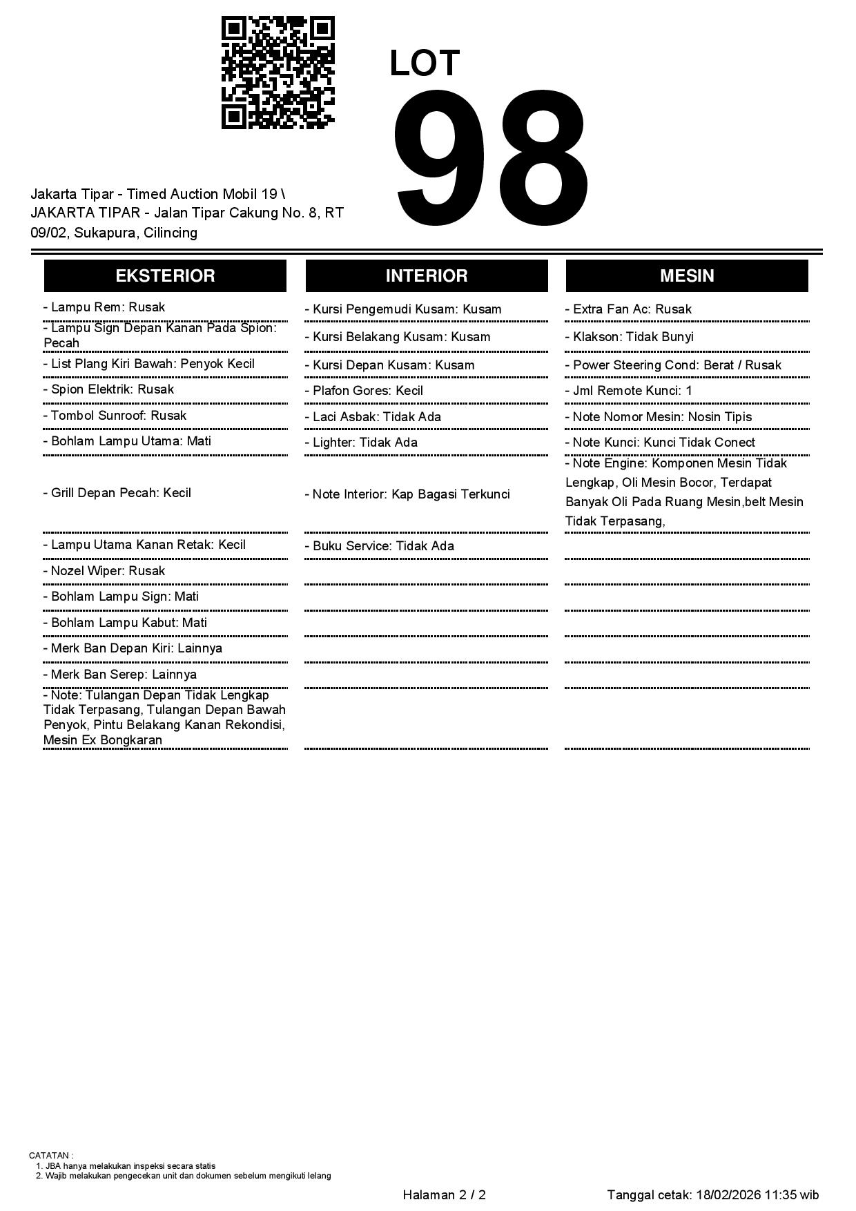 - Kondisi objek lelang dilelang apa adanya, baik kondisi fisik, mesin maupun legalitas kendaraan. Jika terdapat kekurangan/cacat baik yang terlihat maupun yang tidak terlihat, maka semua akan menjadi tanggung jawab/risiko Pemenang Lelang. Oleh karena itu, Pemenang Lelang melepaskan segala hak untuk menuntut dan/atau meminta ganti rugi atas hal tersebut kepada JBA.