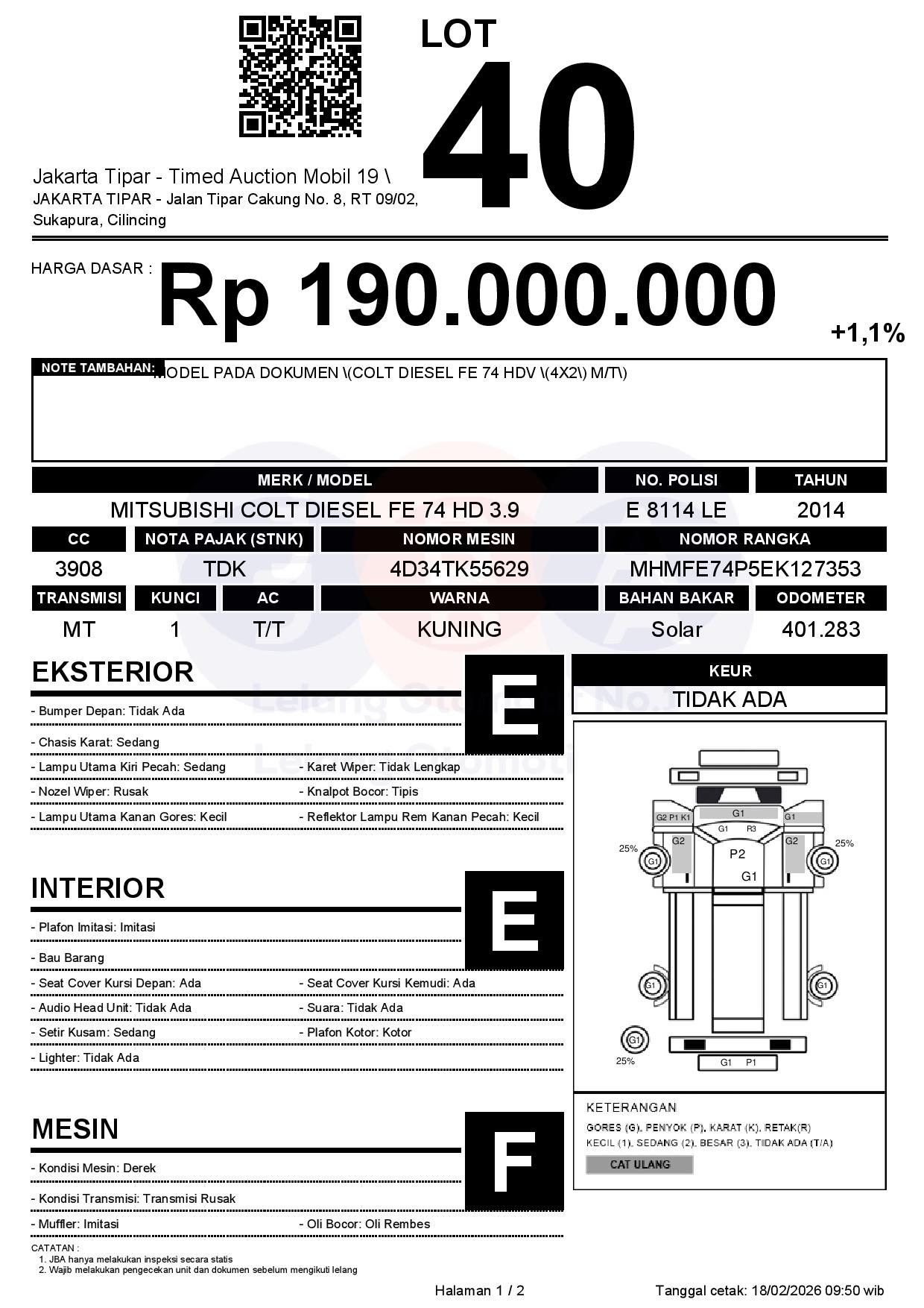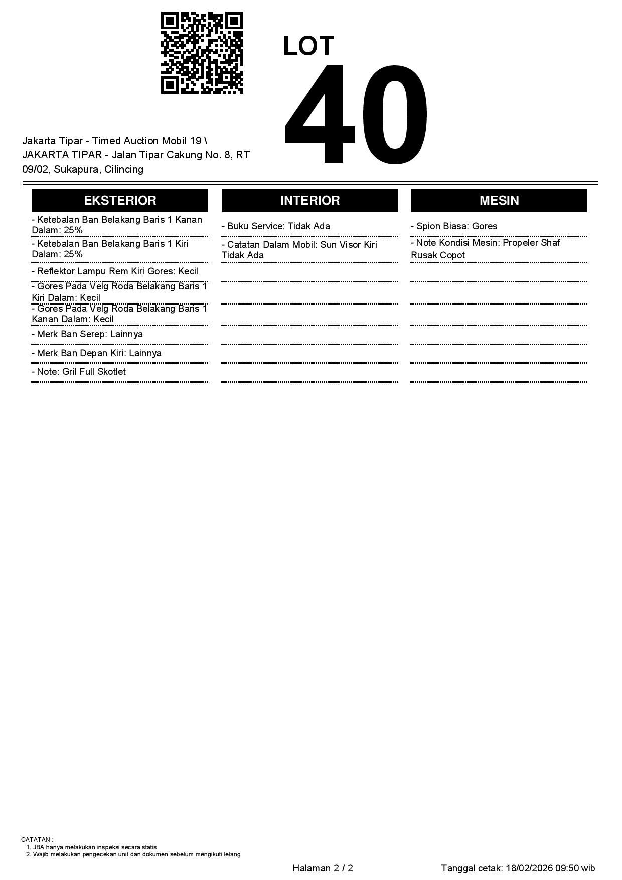 - Kondisi objek lelang dilelang apa adanya, baik kondisi fisik, mesin maupun legalitas kendaraan. Jika terdapat kekurangan/cacat baik yang terlihat maupun yang tidak terlihat, maka semua akan menjadi tanggung jawab/risiko Pemenang Lelang. Oleh karena itu, Pemenang Lelang melepaskan segala hak untuk menuntut dan/atau meminta ganti rugi atas hal tersebut kepada JBA.