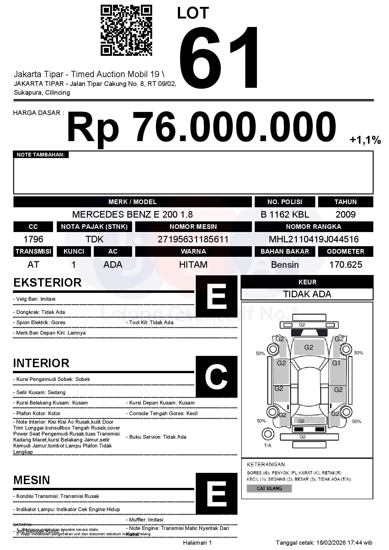 - Kondisi objek lelang dilelang apa adanya, baik kondisi fisik, mesin maupun legalitas kendaraan. Jika terdapat kekurangan/cacat baik yang terlihat maupun yang tidak terlihat, maka semua akan menjadi tanggung jawab/risiko Pemenang Lelang. Oleh karena itu, Pemenang Lelang melepaskan segala hak untuk menuntut dan/atau meminta ganti rugi atas hal tersebut kepada JBA.